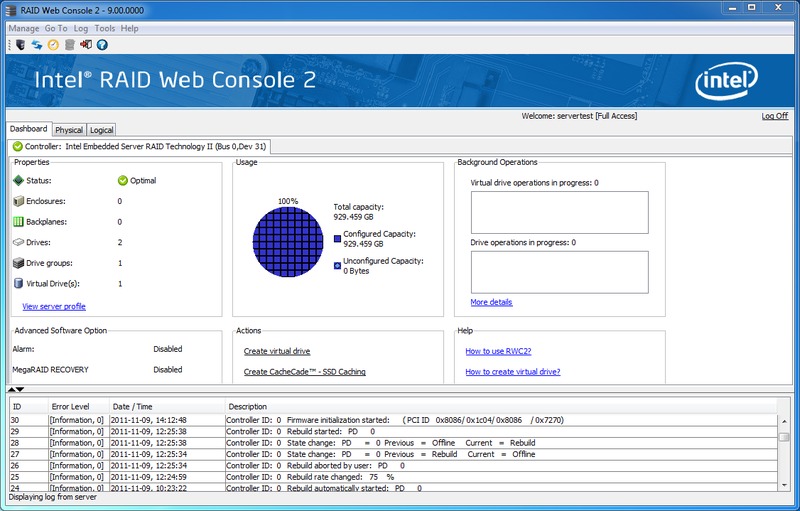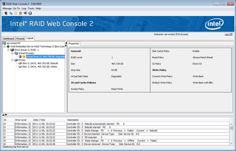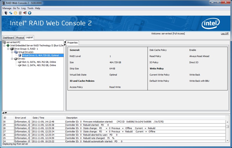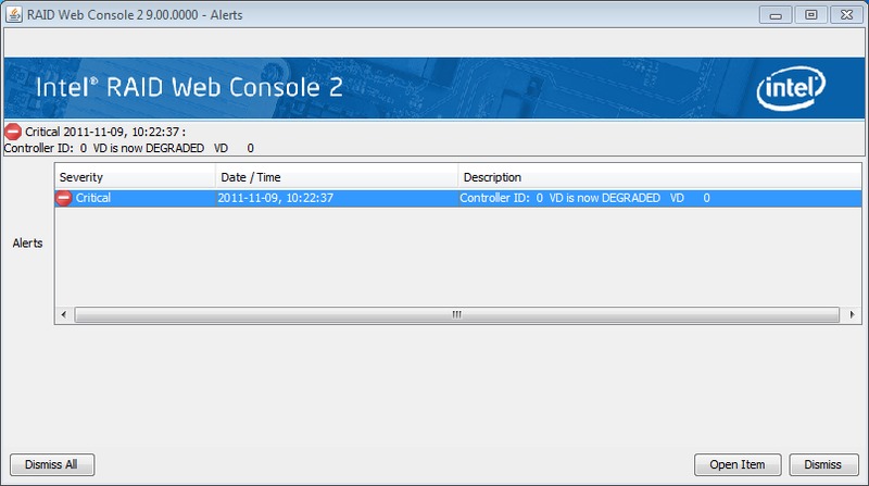 When we did manage to break an array, we received a pop-up alert that let us know that the RAID was degraded. From there, we were able to open the Intel RAID Web Console 2 and rebuild the array. A RAID1 array with two Western Digital Blue 500GB drives took roughly two hours to perform and a RAID1 with two Intel 510 250GB SSDs took roughly 45 minutes.