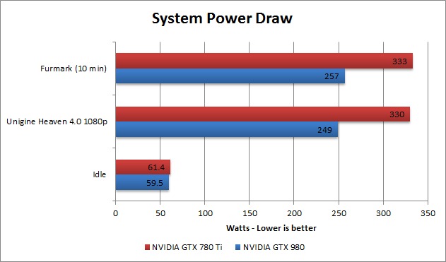 The GTX 980 is rated to only pull 165W which is 85W less than the GTX 780Ti's rating of 250W. If this is true, our test system should pull less power from the wall and run cooler with the GTX 980 compared to the GTX 780Ti.