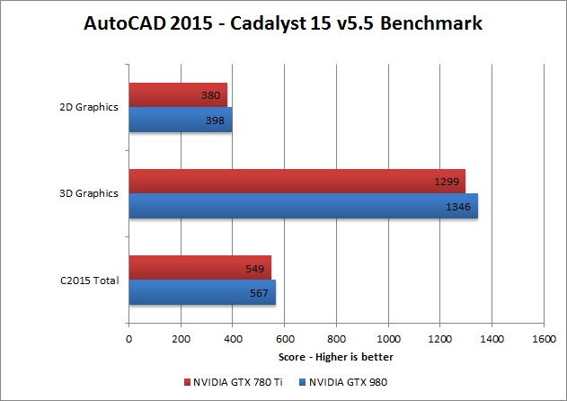 In addition to gaming, we like to test video cards using a number of professional applications. AutoCAD is a very popular 3D Modeling program and it shows some very promising results for the GTX 980. In the graphical and overall portion of the Cadalyst 15 v5.5 benchmark, the GTX 980 performed 4-5% faster than the GTX 780Ti.
