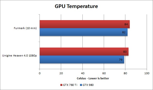 Since the power draw is so much lower on the GTX 980, we expect to see lower temperatures compared to the GTX 780Ti. While the GTX 980 is indeed cooler than the GTX 780Ti, the difference isn't as large as you might expect from a card that uses 85W less power. The reason for this is because pretty much every active cooler in a modern computer – be it a CPU cooler or GPU cooler – ramps its fan based on the temperature of the component it is cooling.
