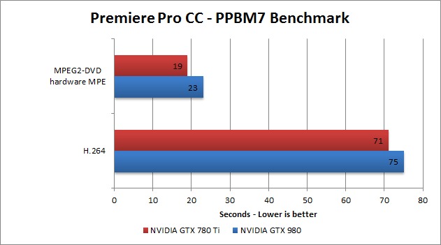 Unlike AutoCAD, Premiere Pro CC shows much lower performance with the GTX 980 compared to the GTX 780Ti. For H.264 encoding, the GTX 980 was 5% slower than the GTX 780Ti. For MPEG2-DVD encoding, the GTX 980 was just over 20% slower than the GTX 780Ti. Given all our other benchmark results, we are fairly confident that this is simply a driver issue rather than a hardware problem.