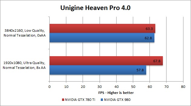 Unigine Heaven Pro 4.0 is our go-to 3D graphics benchmark. It is highly consistent and is a great indicator of performance for a number of games. What we found is that the GTX 980 is quite a bit slower than the GTX 780Ti at 1080p with about a 15% drop in relative performance. At 4K resolutions, however, the GTX 980 pretty much exactly matched the performance of the GTX 780Ti. The reason for this is not entirely clear, but it is likely due either to the additional VRAM on the GTX 980 or simply due to the changes found in the newer Maxwell architecture.