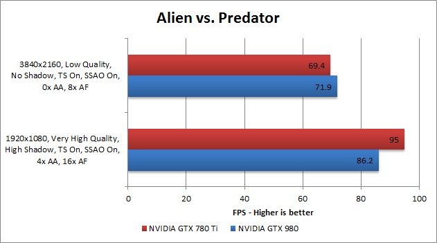 Alien vs. Predator is another staple in our benchmarking process and it shows very similar results as Unigine Heaven. The only difference is that the GTX 980 was actually faster at 4K resolutions than the GTX 780Ti rather than simply matching it.