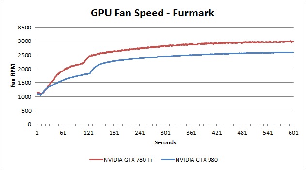 As you can see, during Furmark the fan on the GTX 980 runs about 400 RPM slower than the one on the GTX 780Ti. This may not seem like much, but it results in a pretty significant drop is noise levels. We aren't currently equipped to take extremely accurate noise readings, but subjectively we would say that the GTX 980 is really closer in terms of noise levels to a GTX 760 than it is to a GTX 780Ti or even a GTX 770.