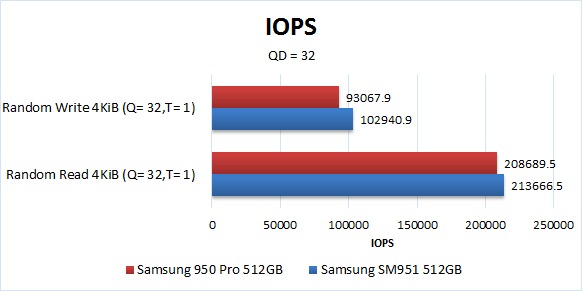 The biggest claim to fame for the Samsung 950 Pro comes from the sequential read performance of 2500 MB/s, which is about 4-5 times faster than a standard SATA SSD. The sequential write performance of 1500 MB/s is not quite as impressive, but is still "only" about three times the performance of most SATA drives. The areas where the 950 Pro is not as impressive are the IOPS and random read/write performance. The 950 Pro does have about twice the random read and read IOPS performance of a SATA SSD, but the random write and write IOPS are only about on par.