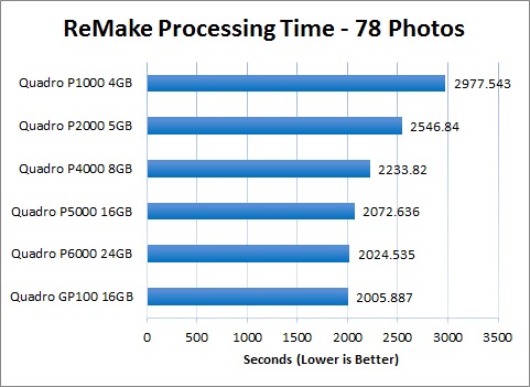 As could be expected, the faster Quadro cards performed better in ReMake. The jumps from the P1000 through the P5000 are especially noticable, but the P5000, P6000, and GP100 all ended up within about a minute of each other.