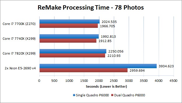 It isn't reflected here, but we also ran into stability issues with dual video cards and larger image sets. When attempting to process the 300 photo set mentioned previously on two P6000 cards ReMake would crash. Because of that, and the minimal impact that a second GPU has when using the fastest processors, we advise against purchasing multiple video cards in a ReMake workstation.