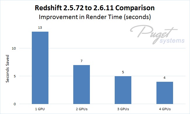 To see if there has been any performance improvement from Redshift 2.5.72 to 2.6.11, we ran the benchmark included in both demo versions of Redshift with 1, 2, 3, and 4 NVIDIA GeForce GTX 1080 Ti video cards. This benchmark uses all available GPUs to render a single, still image – and measures how long the whole process takes. Comparing those times will show if render speeds have changed.