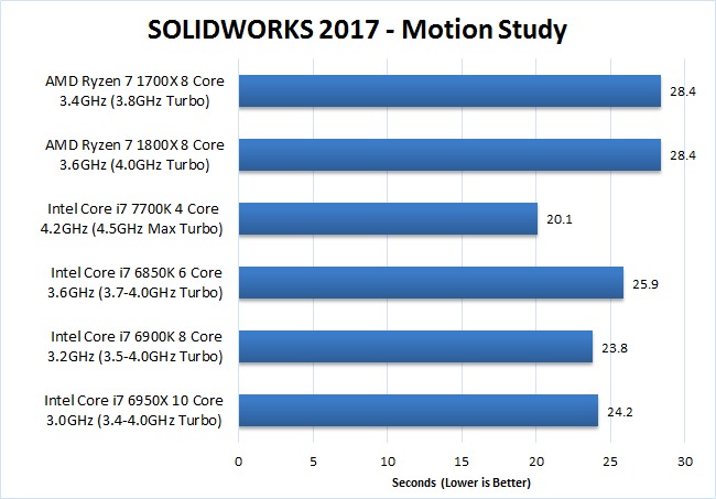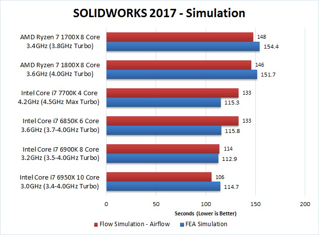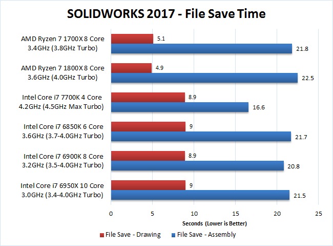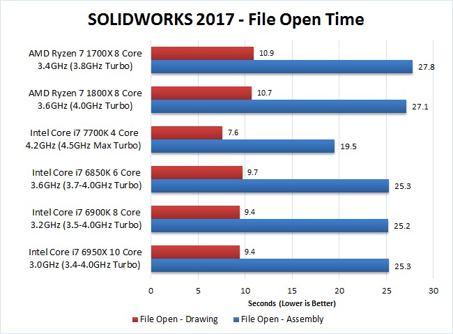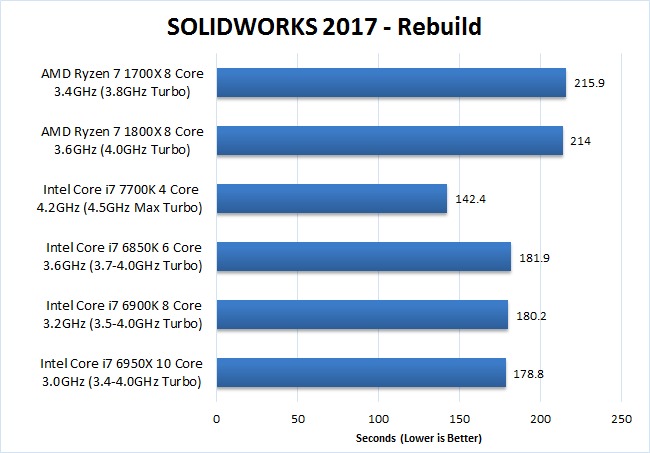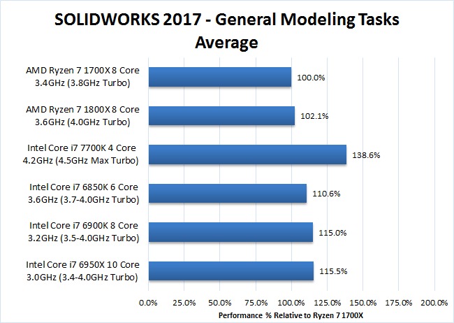 Considering The Ryzen 7 1700X and 1800X are cheaper than the Intel Core i7 6850K (and 6900K for that matter), they fared pretty well compared to the "High End" Intel CPUs although they were certainly a good deal slower. However, most general tasks in SOLIDWORKS are single threaded which makes the Intel Core i7 7700K 4 core CPU much faster than every other CPU we tested in this article – including Ryzen. Specifically, the i7 7700K was on average about 35-40% faster than the 1700x and 1800x.