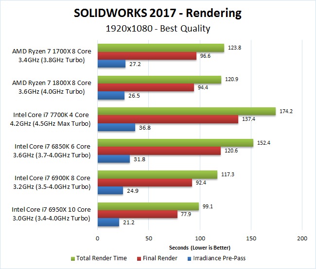 If you do a significant amount of rendering in SOLIDWORKS, Ryzen might be a good choice if you are on a tight budget but anyone doing that amount of rendering can likely either justify purchasing the faster and more expensive i7 6950X or will be using a GPU-based rendering engine like SW Visualize to get faster render times by leveraging the power of their GPU. For the vast majority of SW users, it is clear that you should stick with the Intel Core i7 7700K. Not only is it less expensive and uses less power (so it should run both cooler and quieter), it is also much faster for everything short of rendering.