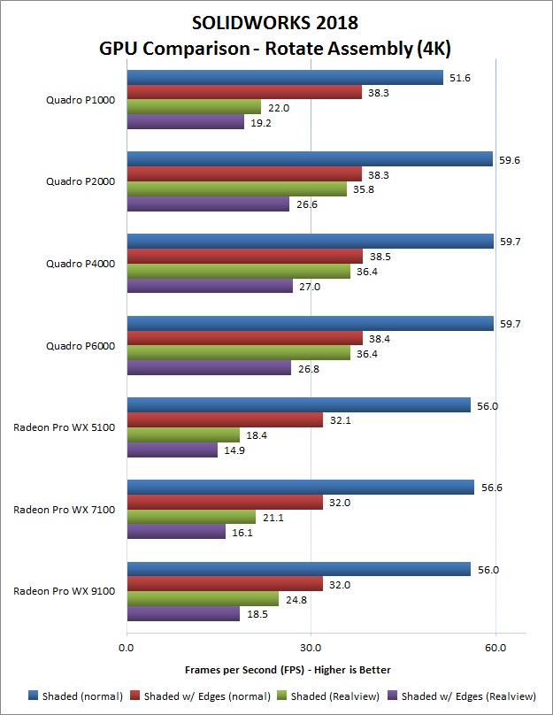We now know that with sufficiently complex assemblies there is a performance difference in SOLIDWORKS 2018! Unfortunately it also looks like the current crop of AMD Radeon Pro cards doesn't quite keep up with the NVIDIA Quadro line, at least when dealing with such massive models. The good news, though, is that even with an assembly like the one we used for testing here you don't need to spend a ton: the Quadro P2000, which is no more expensive than a lot of the mainstream GeForce cards, was just as fast as the P4000 and P6000 that cost substantially more. As such, it is going to be our standard recommendation for SOLIDWORKS workstations.