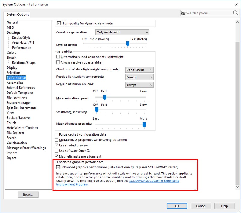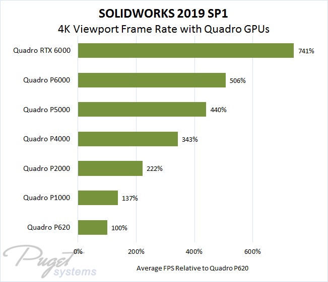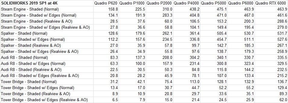 Unlike past years, with SOLIDWORKS 2019 we found a definite difference in viewport performance between video cards. This is because of improvements which the SOLIDWORKS developers have made with this version, so make sure you enable the "Enhanced graphics performance" option in Preferences to take advantage of this speed-up!
