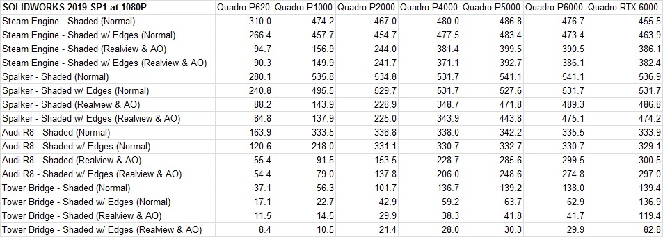 Another interesting thing to note is how much faster the Quadro RTX 6000 is compared to the P6000 when dealing with extremely large assemblies. When using either edges or Realview, the RTX 6000 was always at least twice as fast as the P6000 on our Tower model. I'm curious to see how lower-end cards in that series, like the upcoming RTX 5000 and RTX 4000, perform in that situation.