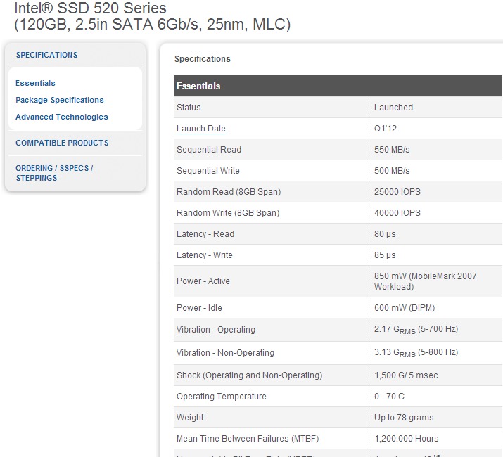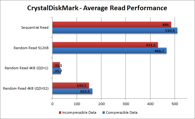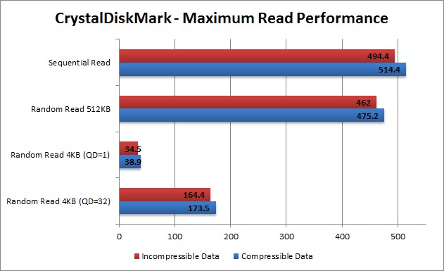 Intel advertises a sequential read performance of 550 MB/s, which is close to our compressible data results. The 35 MB/s (or roughly 7%) difference is small enough to be attributed to the slight variations between CrystalDiskMark and the benchmark program that Intel uses.