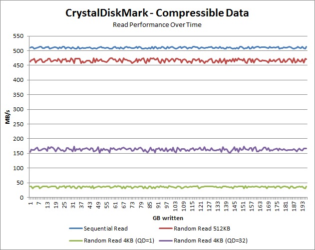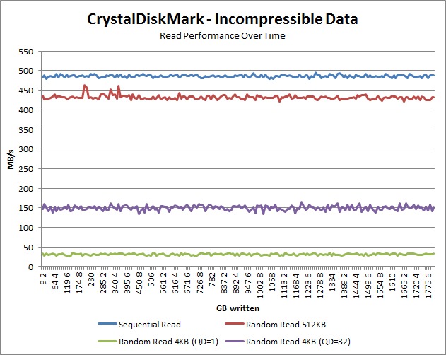 What is interesting is that both the peak and average read performance for incompressible data is slightly lower than the compressible data. It isn't much, but we expected there to be virtually no difference at all so it was a bit of a surprise. Also, the difference between the maximum and average performance is very minimal which indicates that the read performance of this drive is very consistent. And finally, the performance did not drop much even after a ton of data had been written to the drive.