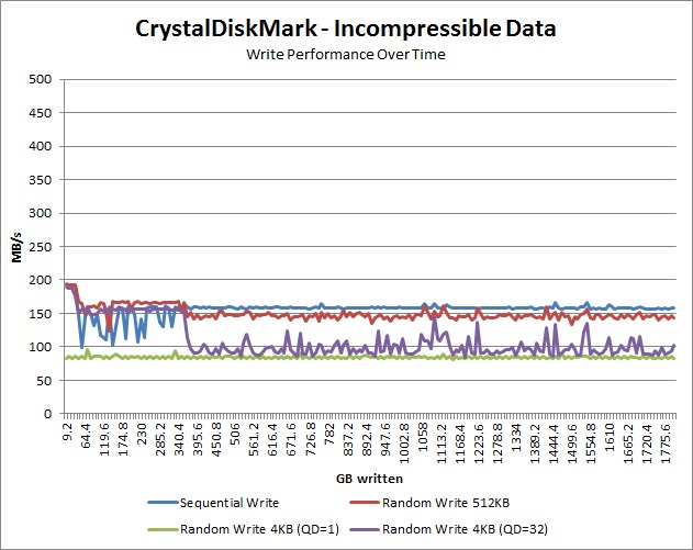 We can also clearly see the difference in compressible and incompressible data over time. Compressible data only has a minor performance loss, but – with the exception of the random write 2KB (QD=1) test – incompressible data has a very large change in performance at two key points. The first is after about 40GB of data had been written to the drive which is when the random 512KB and random 4KB (QD=32) performance drops to about 160MB/s. Oddly, sequential write performance goes a bit crazy at this point, jumping between 100 and 160 MB/s.