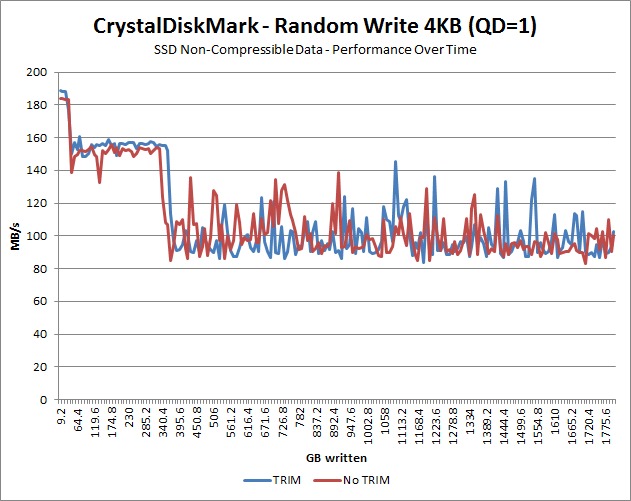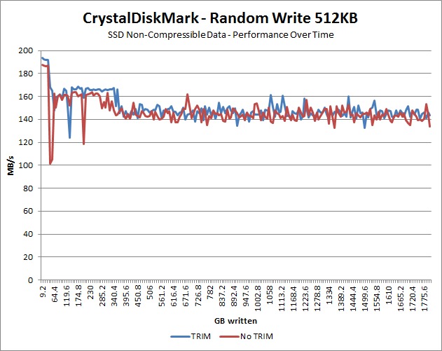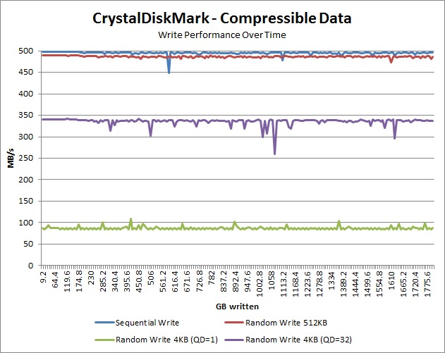 We left the benchmark to loop until it had written a total of approximately 1.8TB worth of data, which essentially filled the drive about 15 times. We also ran our benchmarks multiple times with the data type set to both Random (incompressible) data and All 0x00 (compressible) data to see how much of an effect data type actually has on performance.
