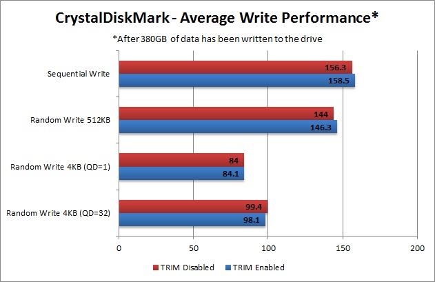 Frankly, we expected TRIM to do a bit more than what our results show. It definitely makes a difference, but only by about 2-4%. We see no reason to turn it off, but at the same time it doesn't appear to be critically important; at least on the model of SSD we used for testing. Solid state drives have come a long way since TRIM was introduced, so we wouldn't be surprised if there was some other unknown type of garbage collecting going on with this drive that was based solely on the controller. Unfortunately, that type of information is usually very confidential and is not something we are likely to be able to test anytime soon.