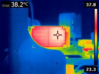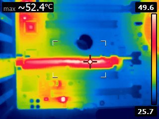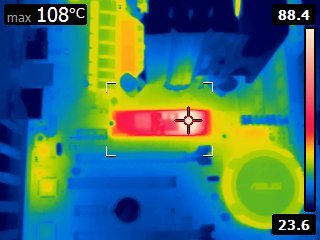 | M.2 heatsink thermal image | Looking from the top, the hottest temperature on the M.2 card we could see was ~53C |