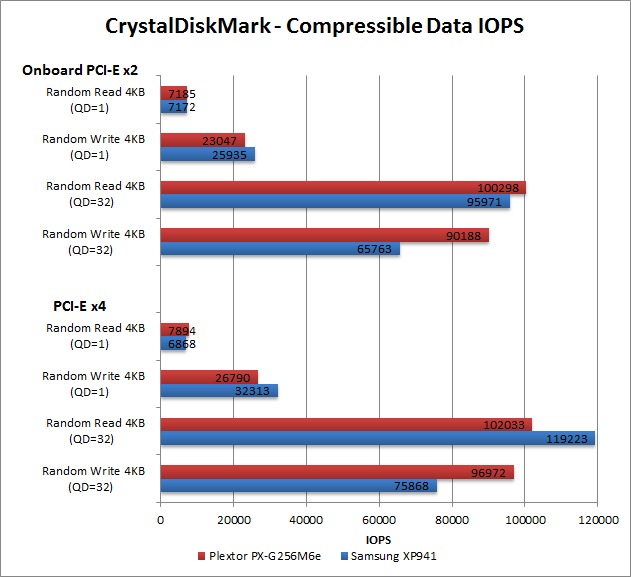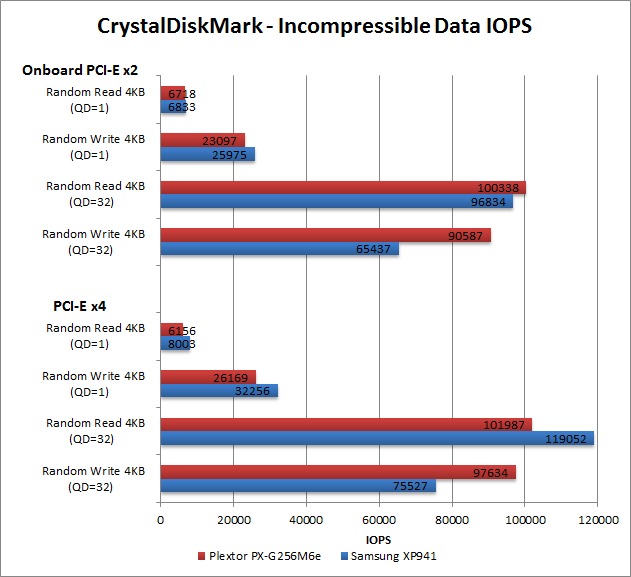Moving on to IOPS (I/O Operations per Second), the Plextor drive again sees only a small difference between PCI-E x2 and PCI-E x4. Oddly, the Plextor PX-G256M6e actually outperforms the faster Samsung XP941 drive on the Random Write 4KB (QD=32) test. The Samsung XP941 again shows a performance benefit by using PCI-E x4 but unlike the transfer speed benchmarks, it is only by about 15-25%