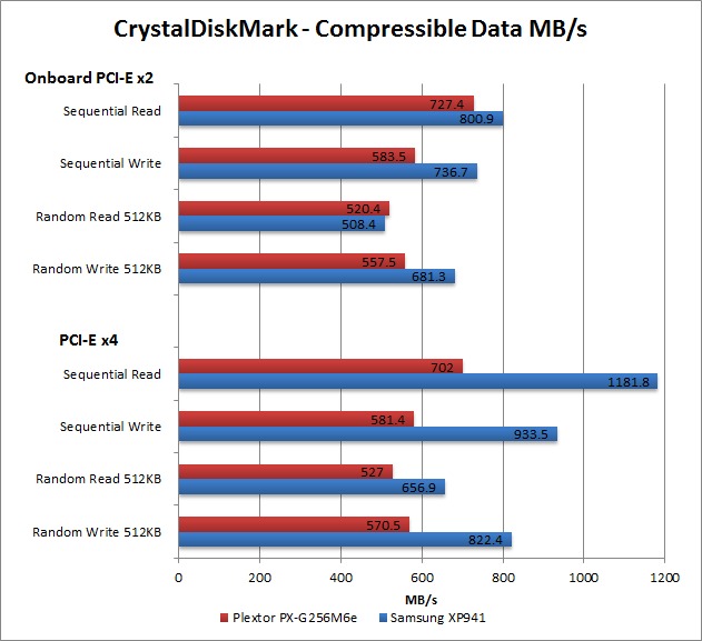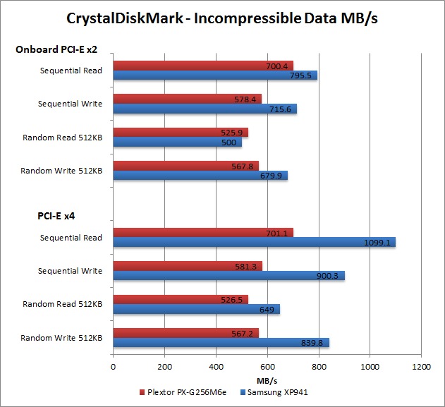 To summarize, the Plextor PX-G256M6e (which is a PCI-E x2 drive) doesn't see much performance benefit by installing it in a PCI-E x4 slot, and in some cases it actually ended up performing a bit worse. However, the Samsung XP941 (which is a PCI-E x4 drive), definitely needs all four PCI-E lanes in order for it to run at peak performance.