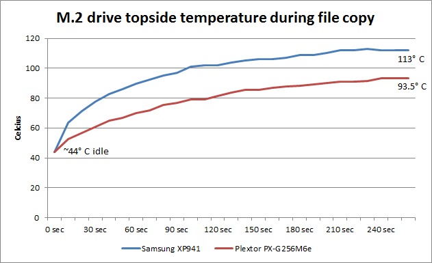 As you can see, both of these drives run very, very hot. To be clear, we weren't doing anything crazy (just making a copy of a bunch of ISO files) yet both drives quickly got up to temperatures that we are not comfortable with. One thing we want to point out is that the actual storage chips are not what is getting really hot, but rather all the other chips on the drive like the controller chip. On the Samsung XP941 the controller is on the top of the drive so the thermal camera can directly see that it got to 113 °C. However, on the Plextor drive the controller chip is on the back of the drive where the thermal camera cannot see it. It is entirely possible that the Plextor drive is actually running much hotter than the 94 °C we recorded since the controller is not directly visible to the thermal camera.