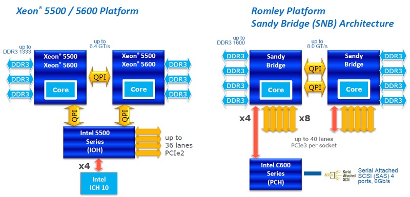Alongside the new E5 Xeon processors, Intel is also launching a corresponding platform codenamed Romley. Pictured below is a comparison between the previous generation 5500/5600 platform and the new Romley platform.