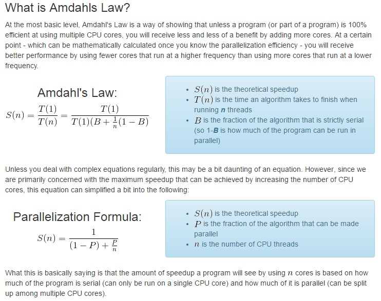 So if "aggregate frequency" is not accurate, what should people use to decide which CPU to purchase? Like we said earlier, there is no magic bullet for this. If your application is CPU-bound (the GPU, HD, and RAM don't impact performance significantly), you could use Amdahl's Law which taken into account the parallel efficiency of the program to calculate the theoretical performance difference between two CPUs. If you are interested in this, we recommend reading our guide on how to use Amdahl's Law. You are still limited to CPUs of the same architecture, it doesn't take into account things like CPU cache, and you have to do a lot of testing up front to determine the parallel efficiency of the program – but this method should be much more accurate than simply multiplying together a CPU's cores and frequency.