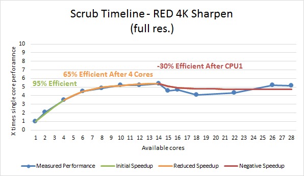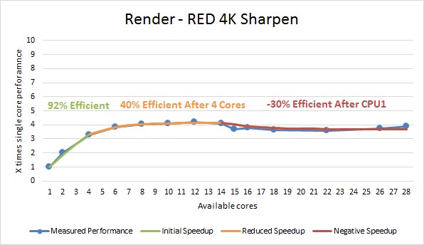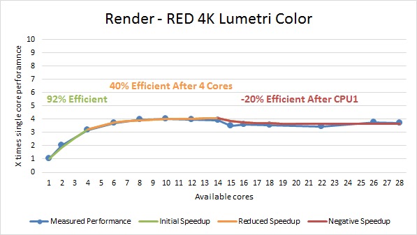 This time, we saw a bit better efficiency for the 1080p project, although it was still very poor with there being little benefit from having more than 3-4 cores. The RED 4K projects all saw a 92-95% efficient for the first four cores, which dropped to 40-65% for the remainder of the first CPU. Unfortunately, although this is a bit better than what we saw when rendering, all three projects saw a moderate decrease in performance when using two physical CPUs.