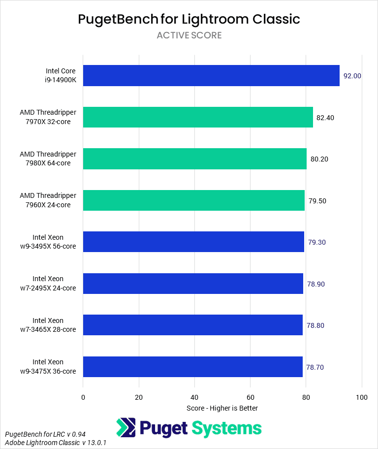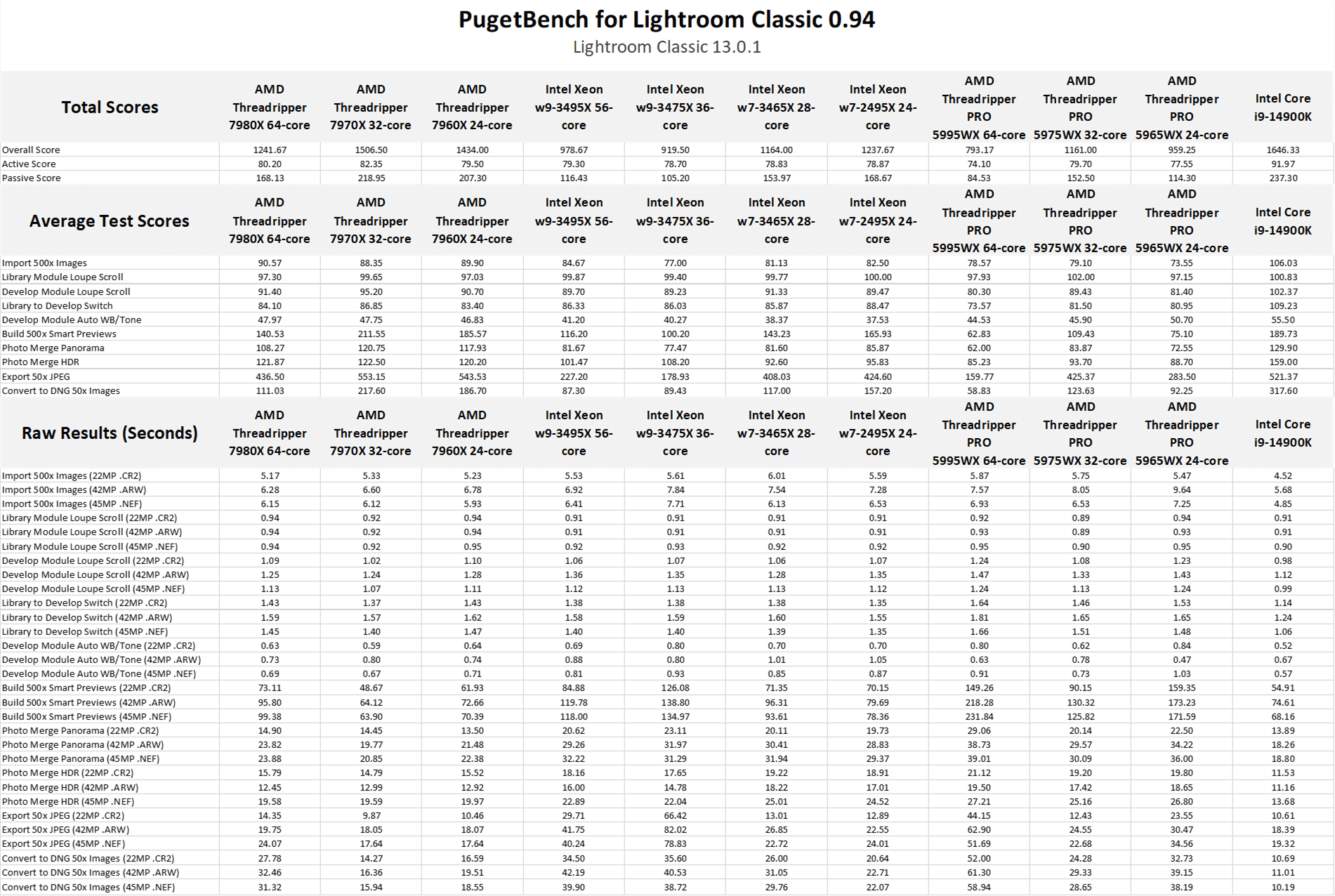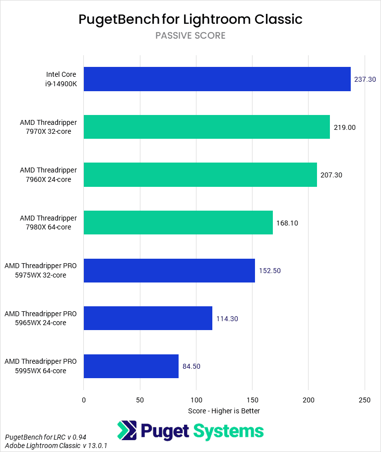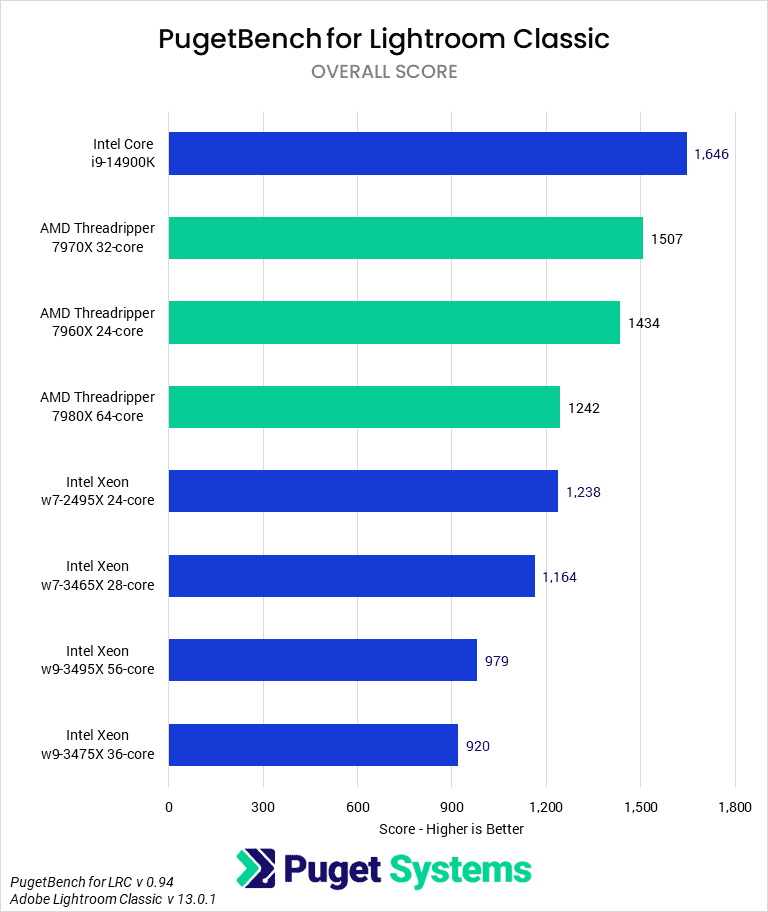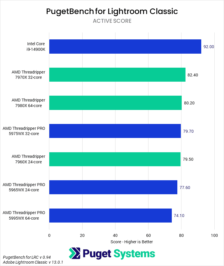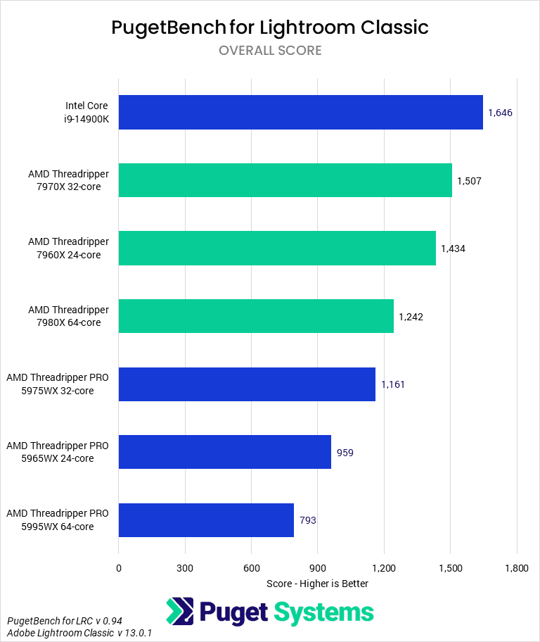 While a more affordable CPU like an Intel Core i9-14900K will give you better performance in Lightroom Classic than Threadripper or Xeon, the new 7000-series processors close the gap significantly. Where the previous generation Threadripper PRO 5000 WX-series was at best nearly 40% slower than a 14900K, the new Threadripper 7970X in particular is within 10%. That is a small enough difference that it would be hard to notice unless you are looking for it, which will help with workflows that combine Lightroom Classic with heavier workloads like photogrammetry.