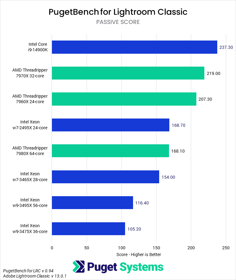 At the very top, the Threadripper 7980X 64-core is a bit of an odd processor for Lightroom Classic as it is slower than either the 24- or 32-core models due to the scaling issues we mentioned earlier. This is not a specific issue with the new Threadripper CPUs and is a fairly common problem that we see on Intel Xeon processors as well. Since Intel has the same problem, this still lets the 7980X be ~30% faster than the Xeon w9-3475X or w9-3495X (which the 7980X is priced right in between), or 45-60% faster for passive tasks in particular. But, again, for Lightroom Classic it is much better to stick to a CPU with 32 or fewer cores so you can get more performance, for less money.