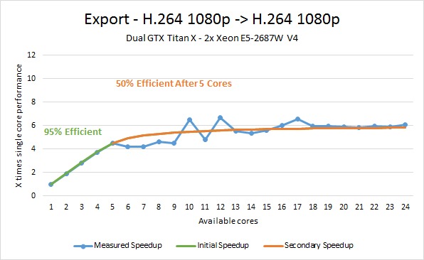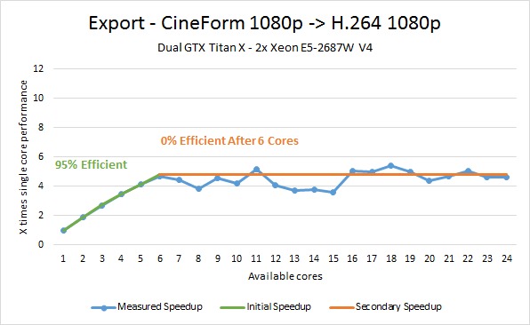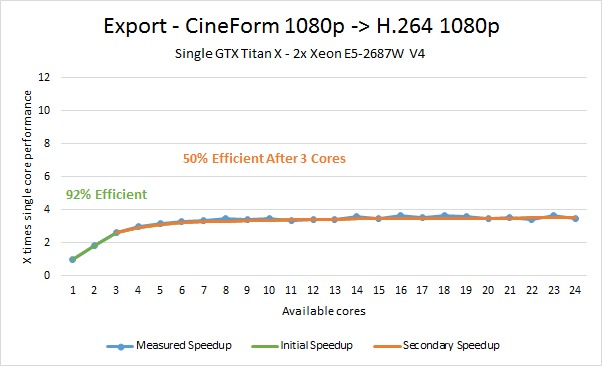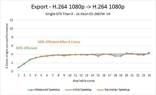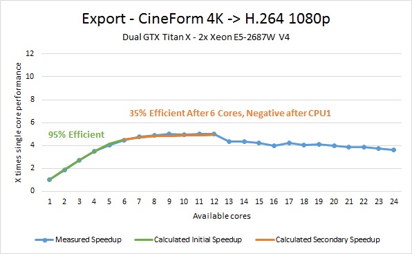 With a single GTX Titan X video card, we saw an initial efficiency of about 91% on average. After about four or five cores, however, this dropped to pretty much nothing. Dual video cards was better with an initial average efficiency of about 93%, but this also dropped off to almost nothing after about 6 cores. What this means is that if you are exporting to H.264 1080p, you would ideally want a CPU with about four or six CPU cores. Eight cores can be beneficial in some instances, but if you have to sacrifice more than .1-.2GHz for those extra cores it will likely actually result in lower performance.