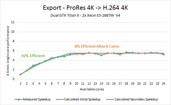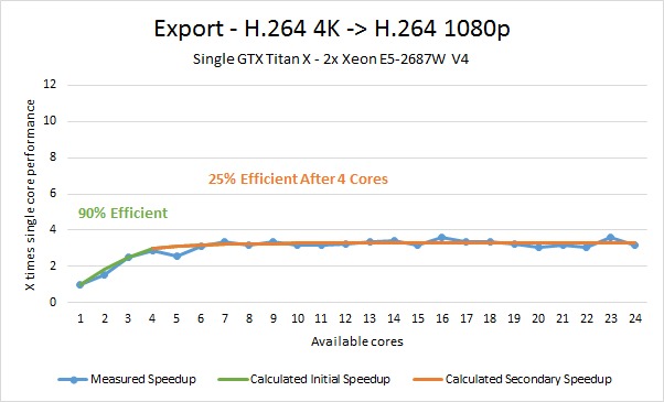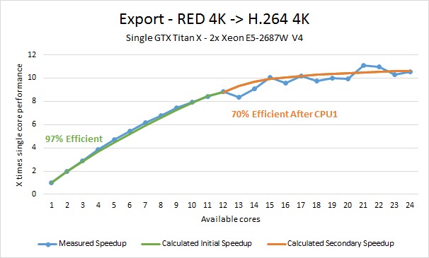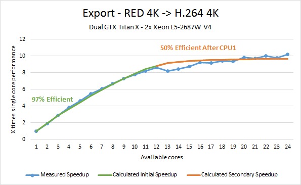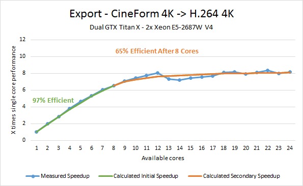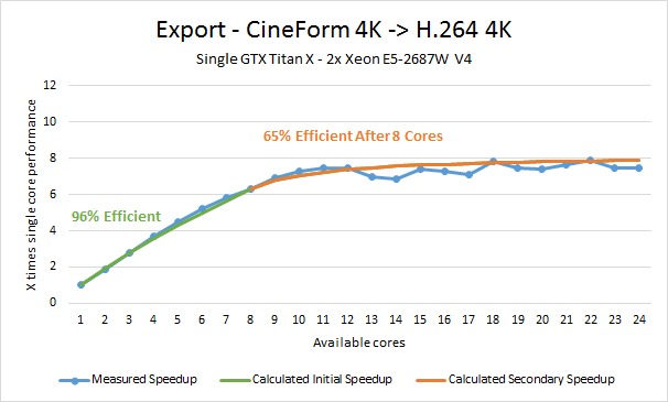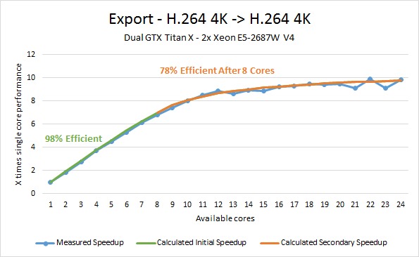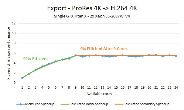 When we upped the export resolution to 4K, we saw much better efficiency numbers. Not only was the initial efficiency higher (about 96.5% on average), Premiere Pro was also able to effectively use a much higher number of CPU cores. Where at 1080p anything more than six or maybe eight cores wouldn't be beneficial, in this case the initial multi core efficiency numbers lasted until around twelve cores. In other words, when exporting to 4K a ten core CPU should be great and in some instances a CPU (or multiple CPUs) with even more cores may give you a performance increase.