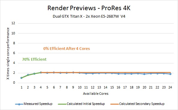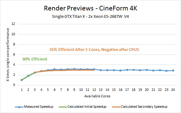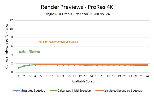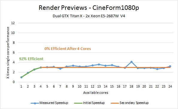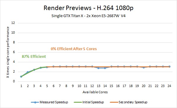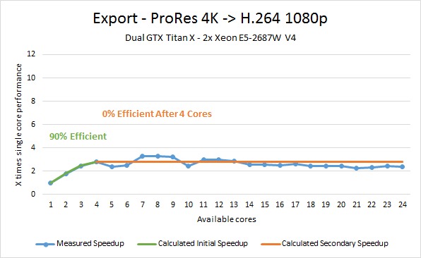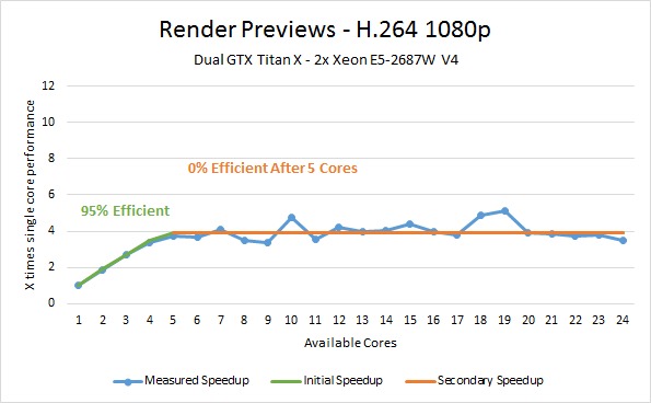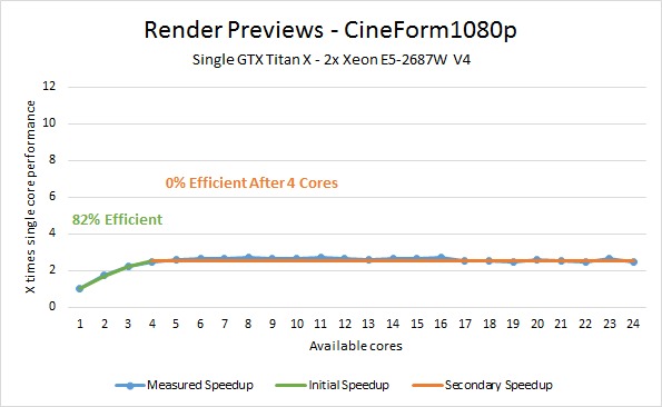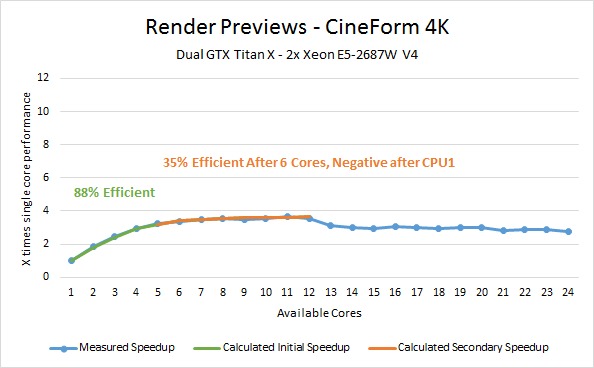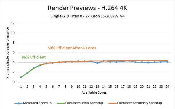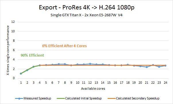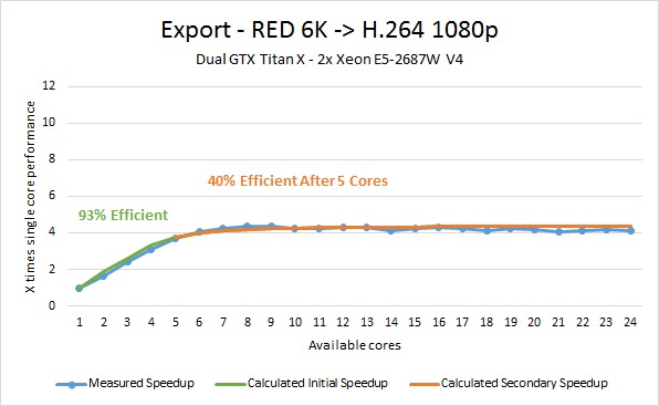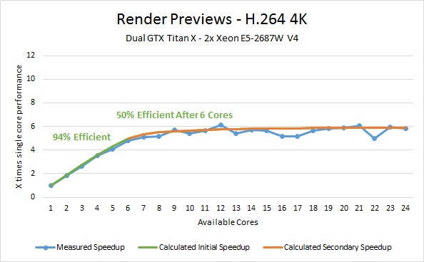 In the graphs above, the lines with dots are the actual speedup we recorded in our testing. The solid lines shows the calculated efficiency we arrived at by using Amdahl's Law on the results. The green line indicates the initial speedup we saw while the orange line is the efficiency after the system hit some sort of bottleneck (whether it was due to the GPU, RAM, cache, or simply an issue from Premiere itself).