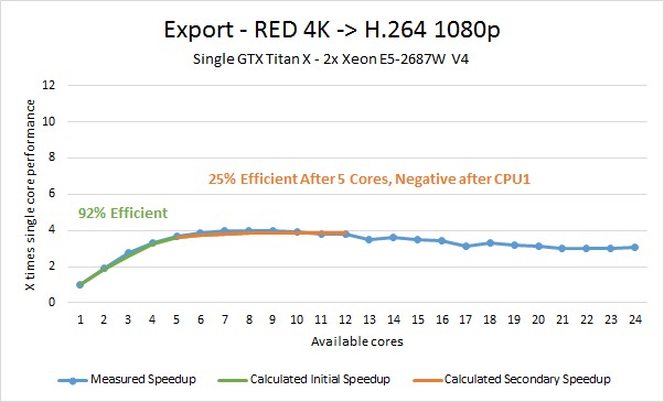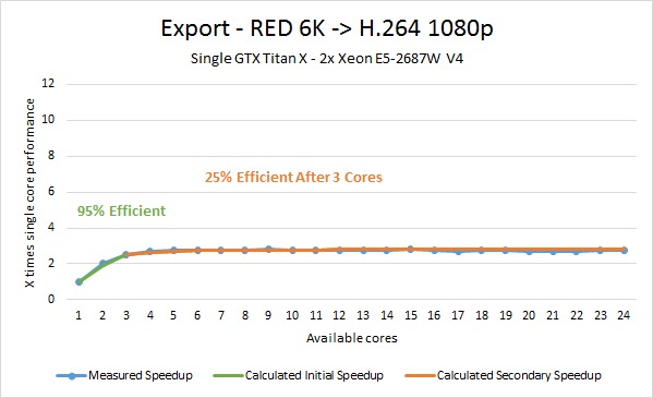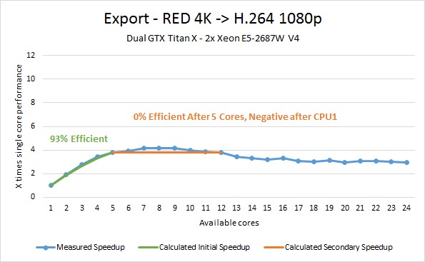 What is surprising is simply how consistent the results were between the different codecs and resolutions. The amount of time it took in seconds to export each was vastly different, but the speedup per core was very similar. From our data, it appears that there is little to no benefit to having more than four or five cores with a single high-end GPU when exporting to 1080p. In fact, we even saw a drop in performance when we added a second physical CPU when using the RED 4K footage.