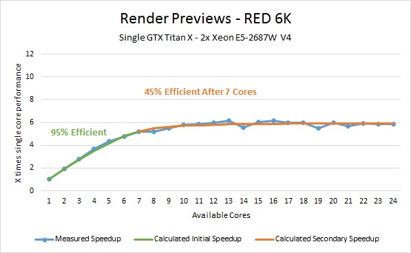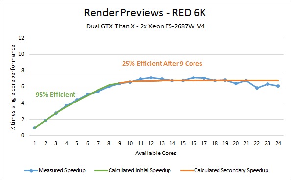 | RED 6K | 95% (45% after 7 cores) | 95% (25% after 9 cores) |