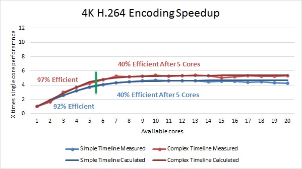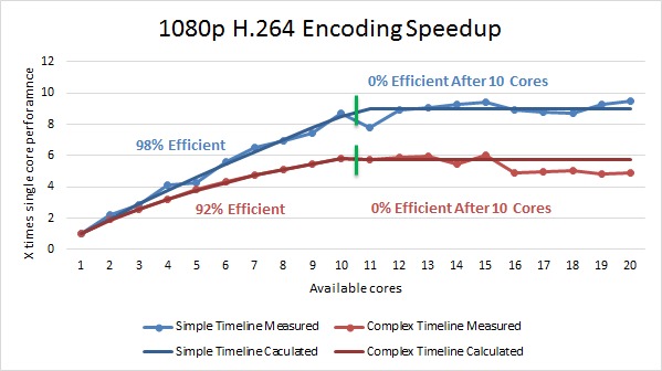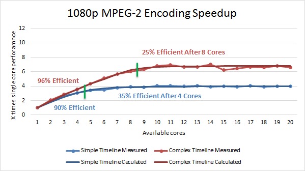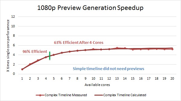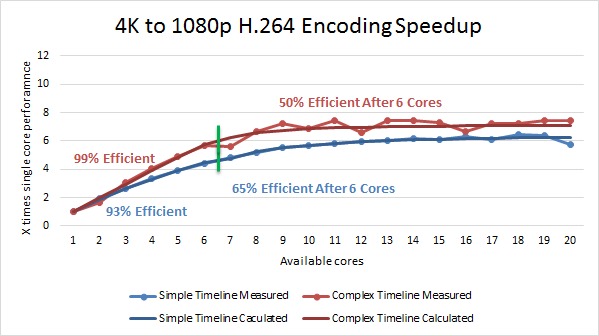 In the graph above, the lines with dots are the actual speedup we recorded in our testing. The solid lines shows the calculated efficiency we arrived at by using Amdahl's Law on the results. What is interesting is that for all of our testing in Premiere Pro we saw a very distinct point (marked as a green line) where the parallel efficiency makes a drastic change for the worse.
