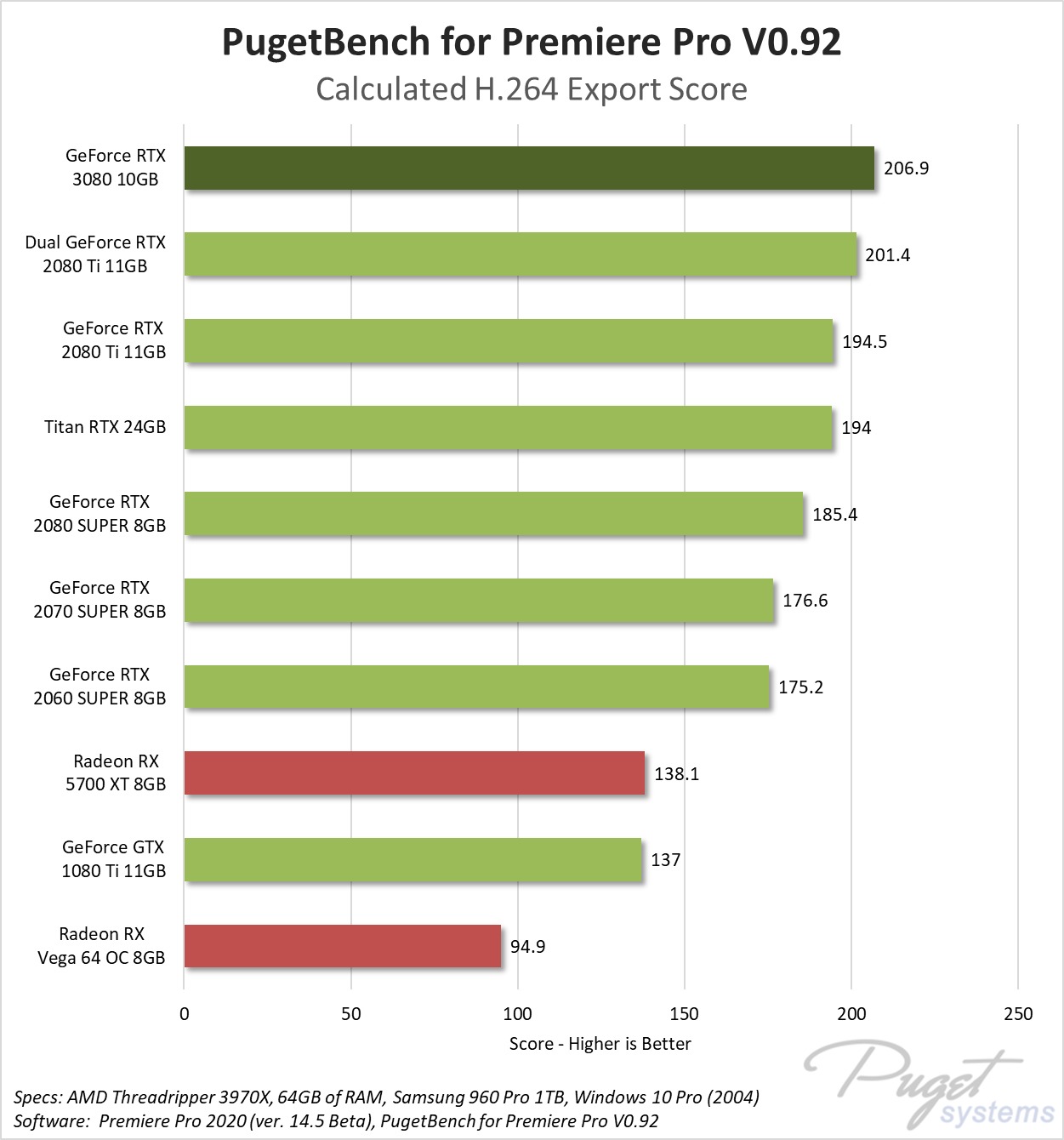 Due to the recent addition of GPU hardware encoding, exporting to H.264 is another area that now can benefit (albeit to a lesser degree) from a more powerful video card. Here, the RTX 3080 is around 6-18% faster than the RTX 20-series GPUs we tested, and 50% or more faster than an AMD Radeon GPU or an older GTX 1080 Ti.