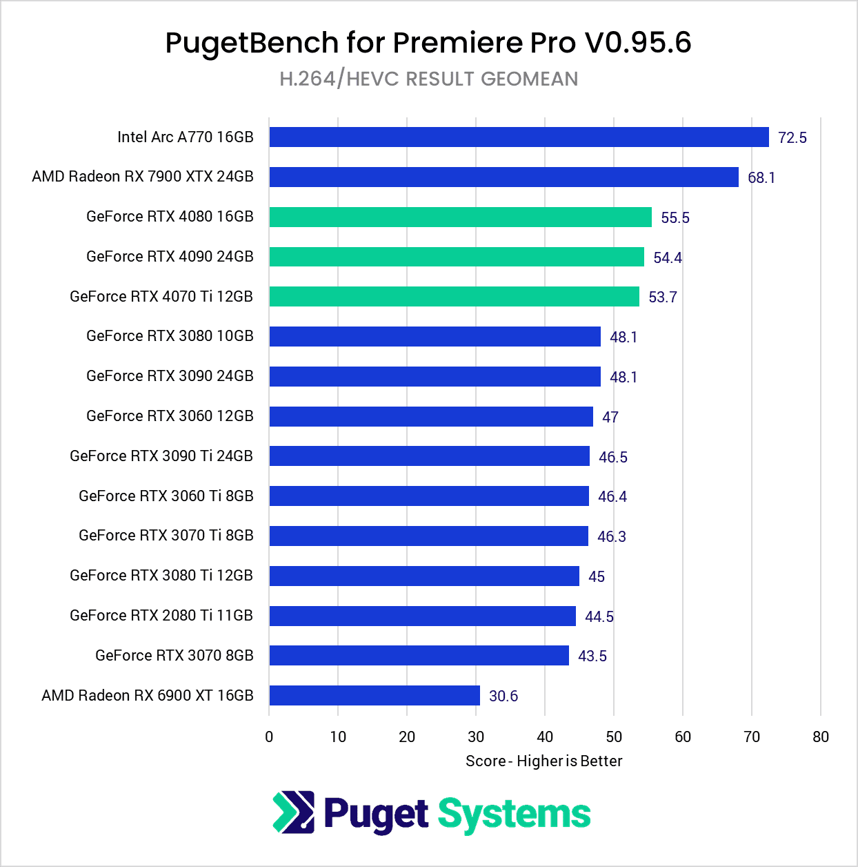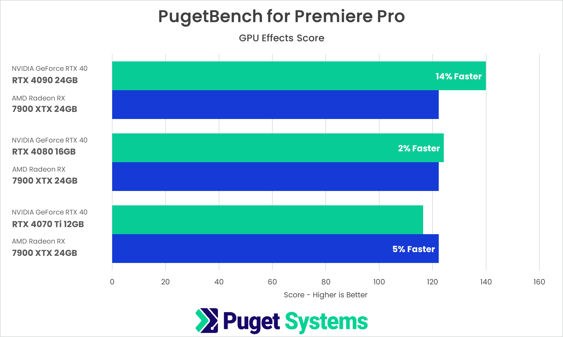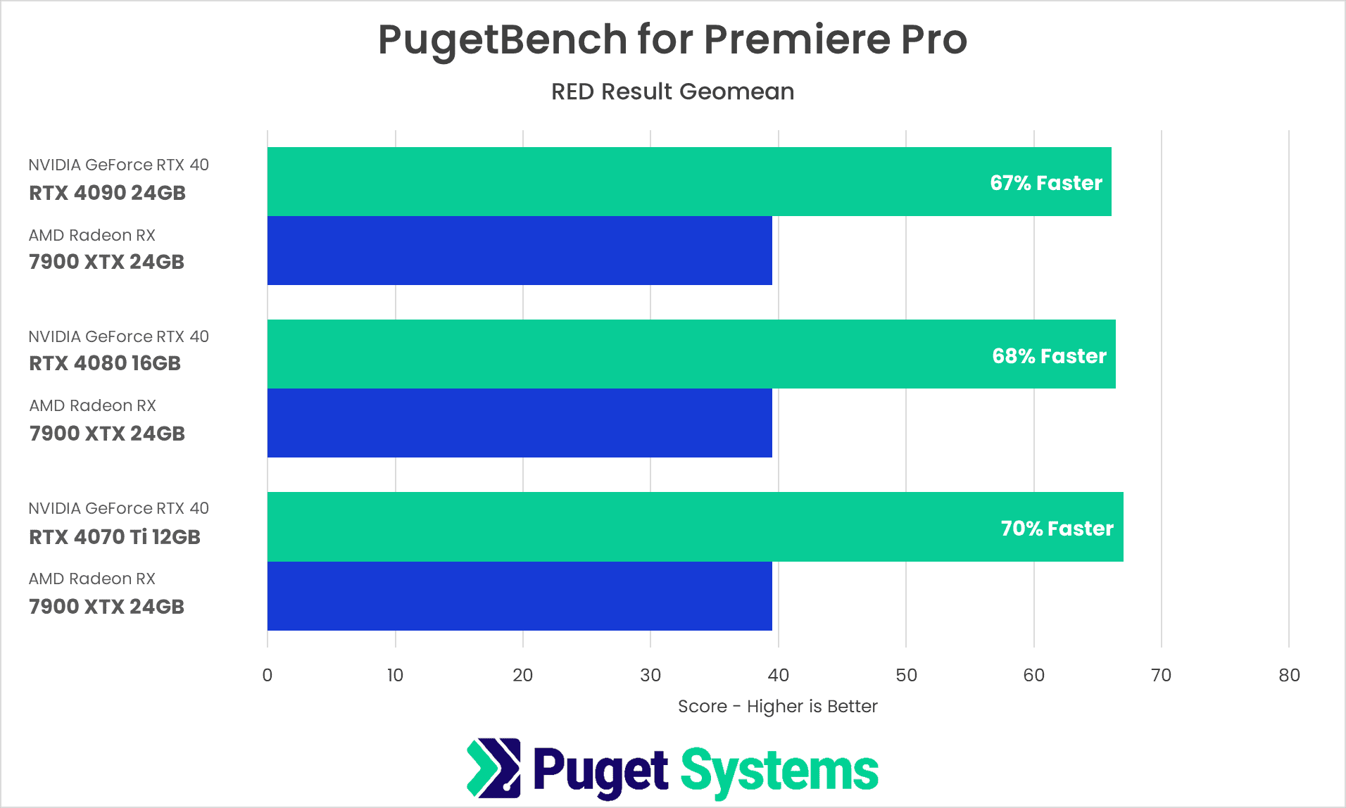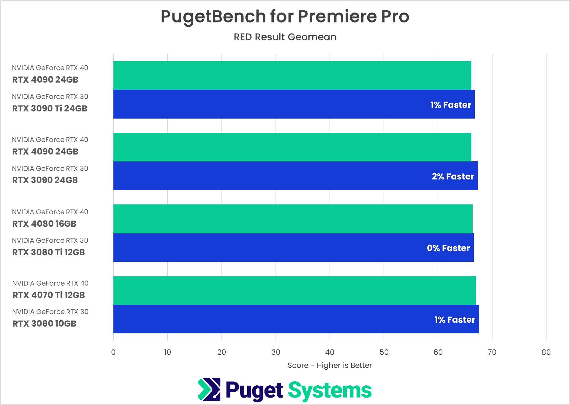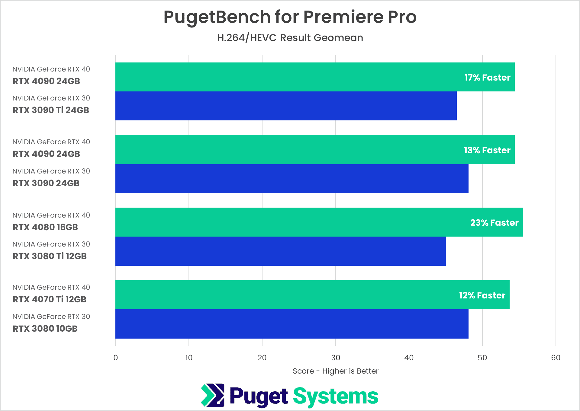 Overall, the NVIDIA GeForce RTX 40 Series GPUs do very well in Premiere Pro, but in most cases are an incremental improvement over the previous generation. High-end users are the ones who would benefit the most from an upgrade, as the new RTX 4090 can give you up to a 20% performance increase over the RTX 3090 in some workloads. But for the RTX 4080 and 4070 Ti, you are usually only looking at a 5-10% increase in performance.