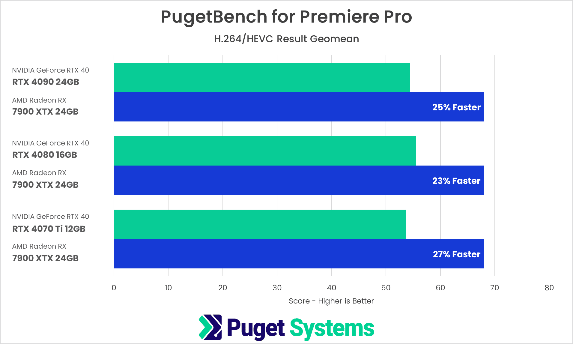 First, in chart #2 we are looking at the performance of GPU-accelerated effects in Premiere Pro. Here, the results are remarkably similar to the Overall Score. AMD and NVIDIA both do well in terms of performance, so if GPU effects are a concern for your workflow, it will come down to other factors. The 24GB of VRAM on the 7900 XTX is certainly a benefit for AMD, but NVIDIA also has things going for them such as their (historically in our experience) more stable drivers. The benefit of each of these is subject to what you want to prioritize for your system, however, so we would say that AMD and NVIDIA are largely a wash for this test.
