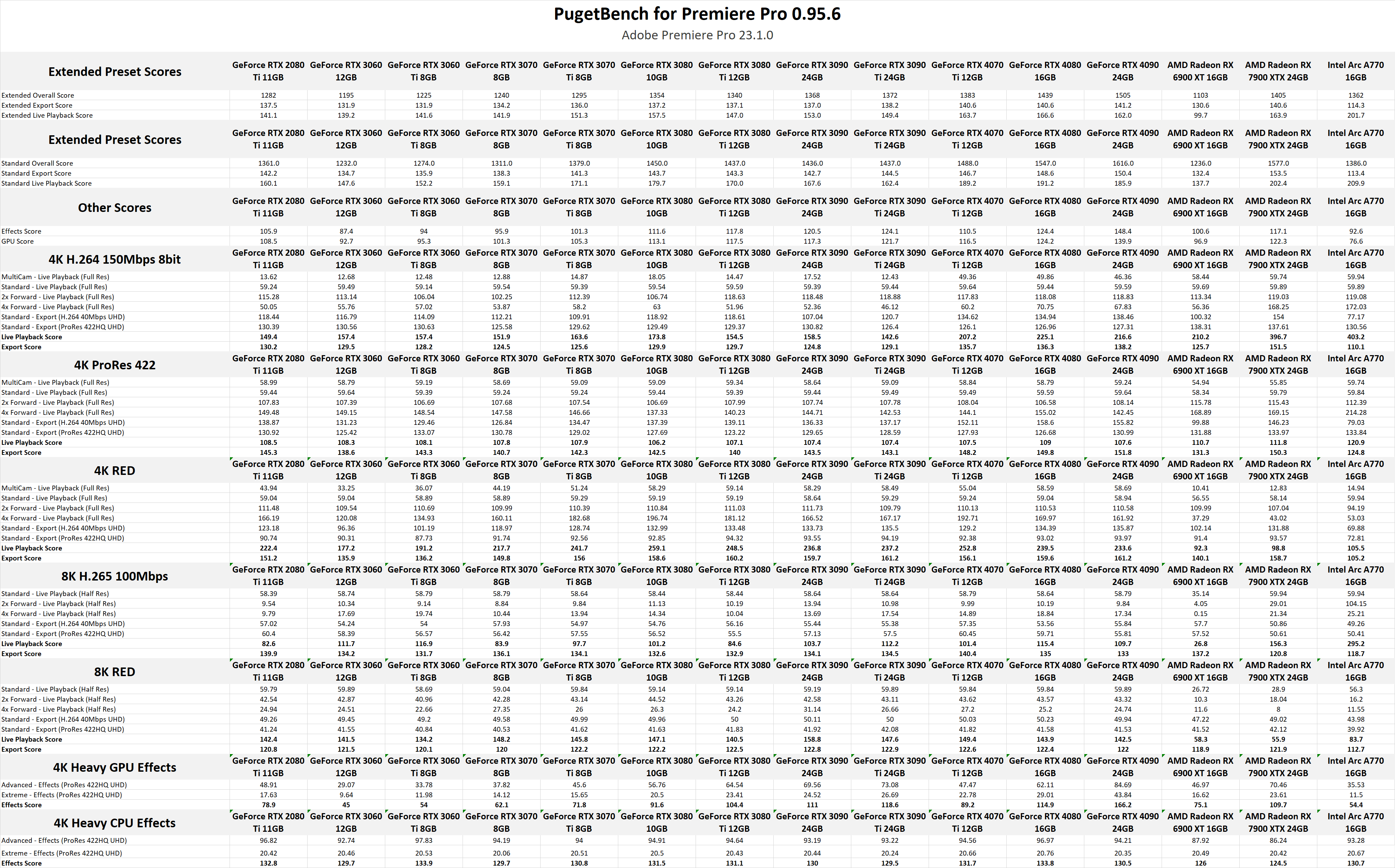 Things get more interesting when we examine the performance of different types of codecs. In our H.264 and HEVC tests (chart #3), the AMD Radeon 7900 XTX showed a solid 23-27% performance lead over the NVIDIA GeForce RTX 40 Series cards. You could make up for NVIDIA’s deficit in this area if you use an Intel Core CPU that supports Quick Sync (as that would be used for H.264/HEVC decoding in place of the GPU), but if that isn’t an option, AMD is a stronger choice for any LongGOP codecs that Premiere Pro has GPU decoding support for.