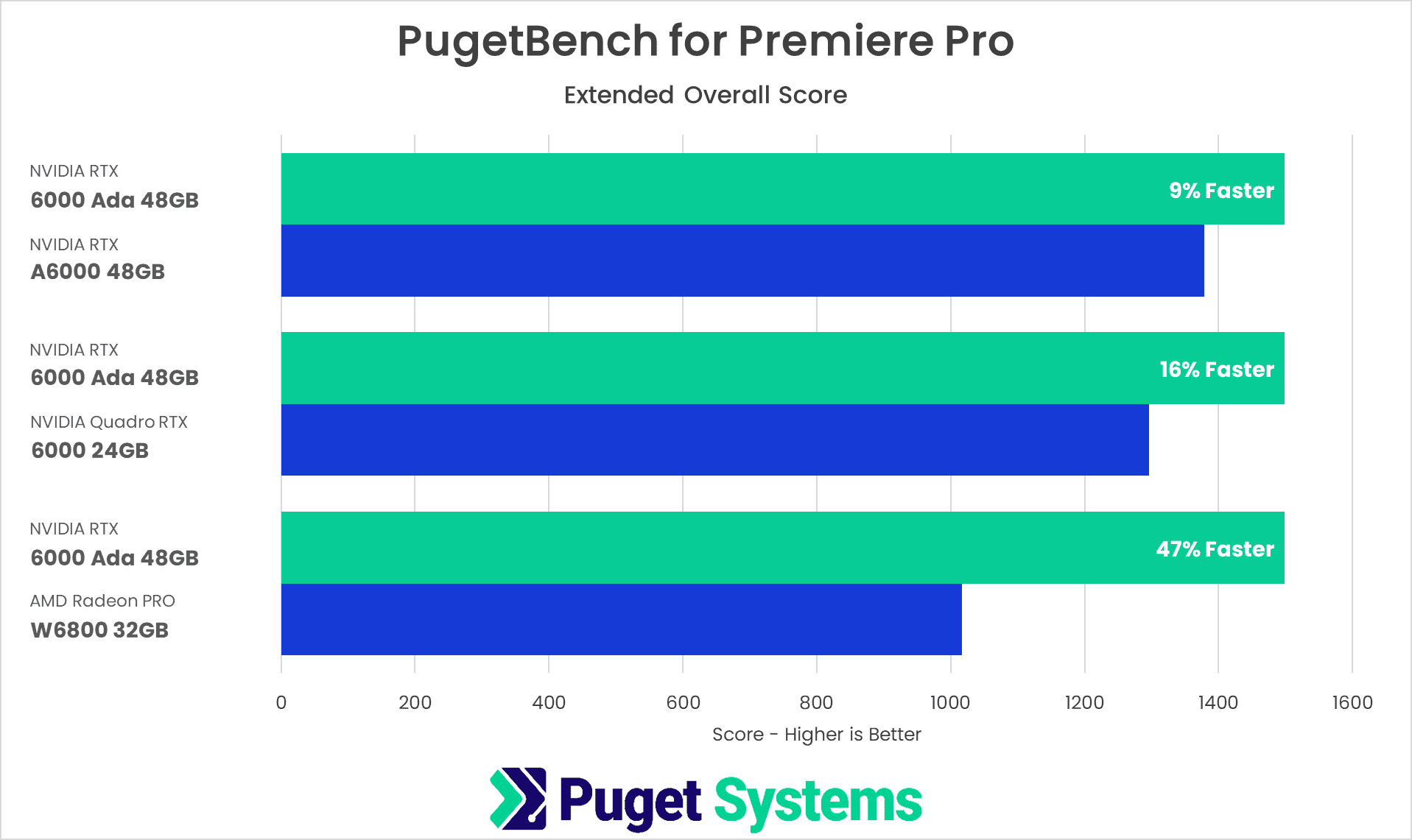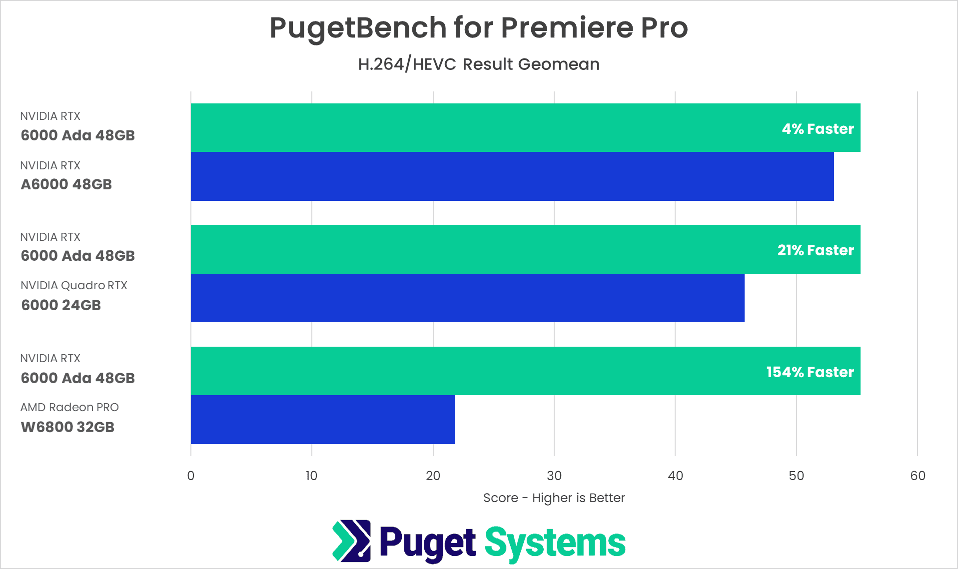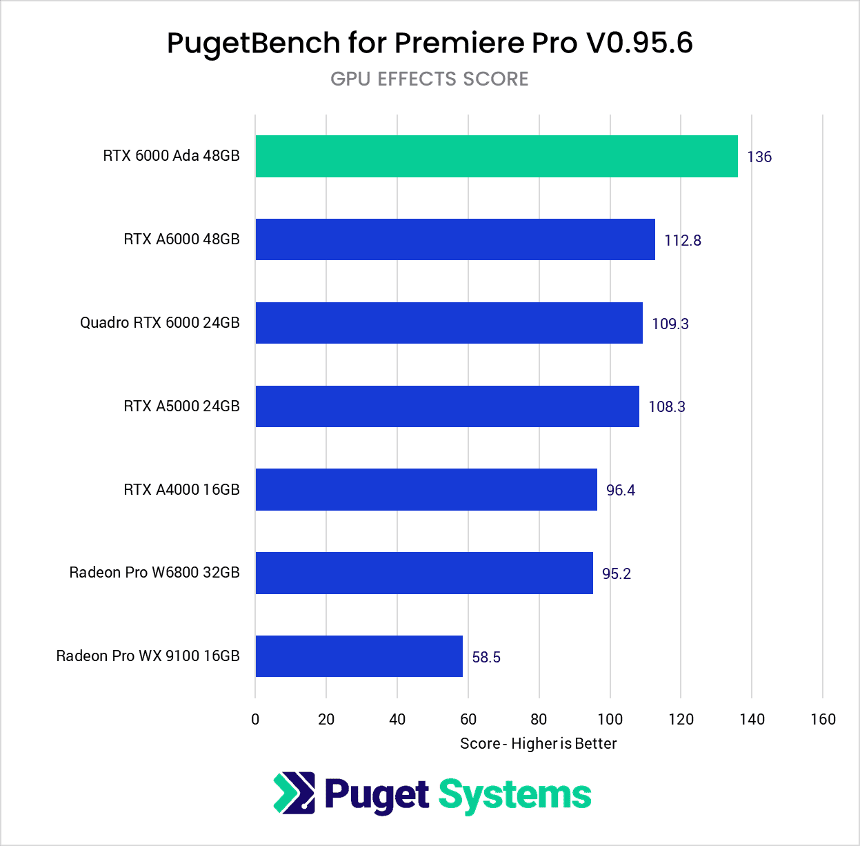 Overall, the NVIDIA RTX 6000 Ada does well in Premiere Pro, but in most cases, it is an incremental improvement over the previous generation. In the best case, it is about 25% faster than the previous generation RTX A6000, but that is isolated almost entirely to GPU-accelerated effects like noise reduction and blurs. While a 25% performance gain is by no means bad, it is offset by the fact that the RTX 6000 Ada has a much higher MSRP over the RTX A6000 ($6,800 vs. $4,650).