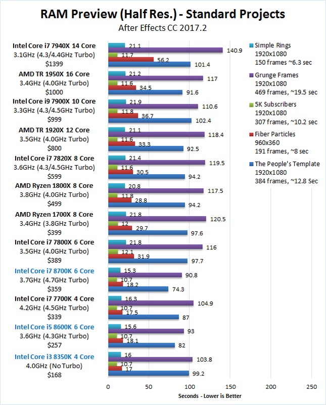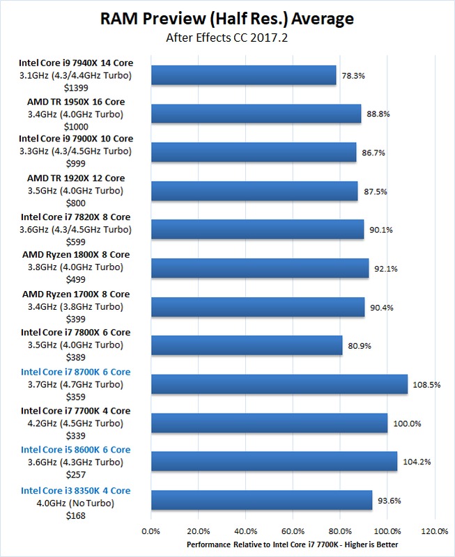 Although the new Coffee Lake CPUs saw a significant increase in core counts, After Effects is only marginally effective at utilizing the additional cores. However, even without terrific core scaling the RAM Preview performance with the Core i7 8700K is still a very respectable 8.5% faster than the Core i7 7700K. In fact, even the Core i5 8600K ended up being faster than the Core i7 7700K which is a very nice surprise.