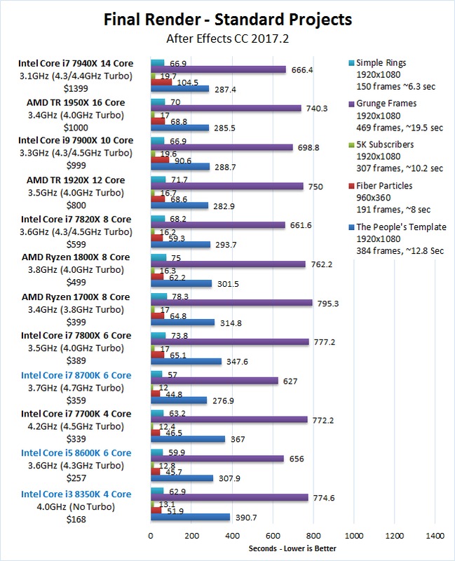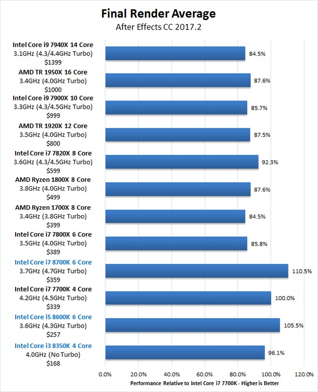 For general AE usage, these CPUs are terrific. The performance gains are not as large as we've seen in some other applications since AE isn't terribly effective at utilizing more than a handful of CPU cores, but the Core i7 8700K was a solid 9% faster than the Core i7 7700K. Even the Core i5 8600K did very respectably, coming in at 5% faster than the Core i7 7700K while also being $80 cheaper.