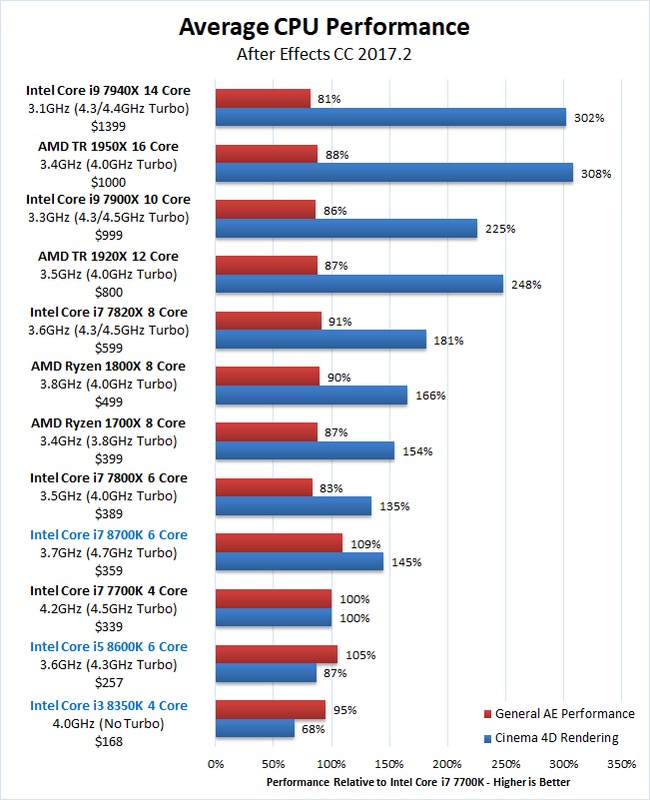 For 3D rendering, the new Core i3 and i5 CPUs are not that impressive but the Core i7 8700K did a fantastic job. This makes the Core i7 8700K a great CPU if you occasionally or rarely use the Cinema 4D renderer, although there are a number of other choices if you need even more 3D rendering performance. Our go-to recommendation for this type of workload is currently the AMD Threadripper 1920X or 1950X as you get terrific 3D rendering performance for your dollar with only a relatively modest drop in general AE performance.