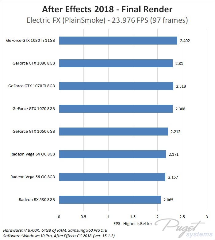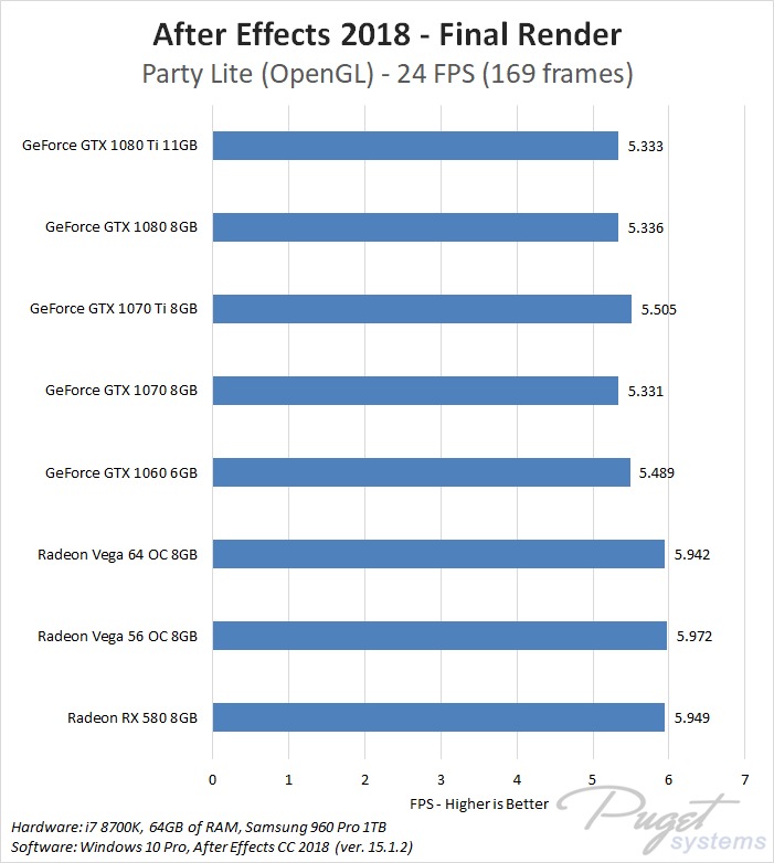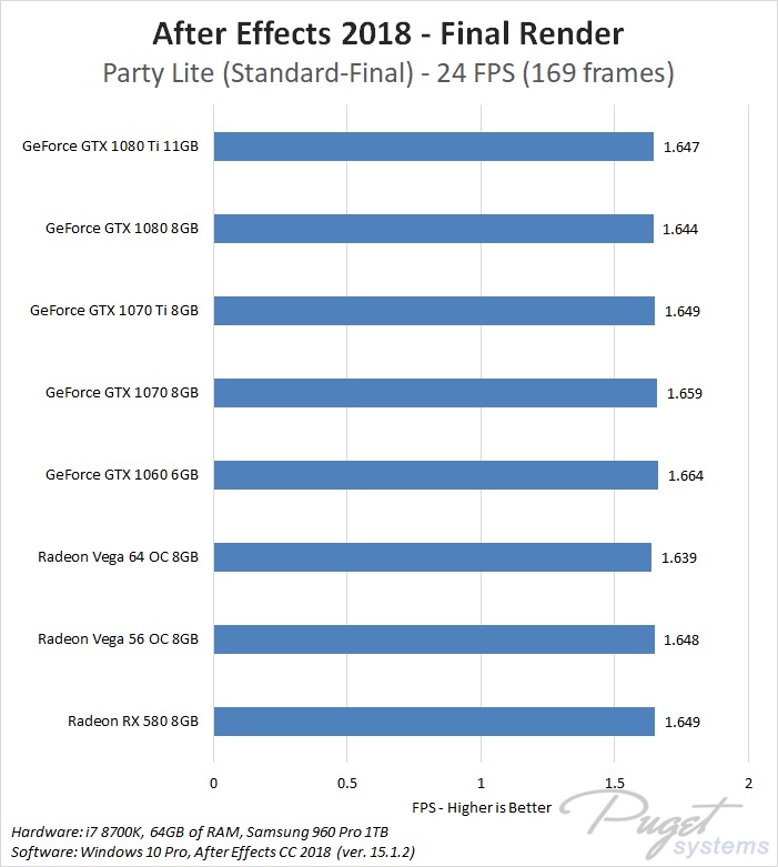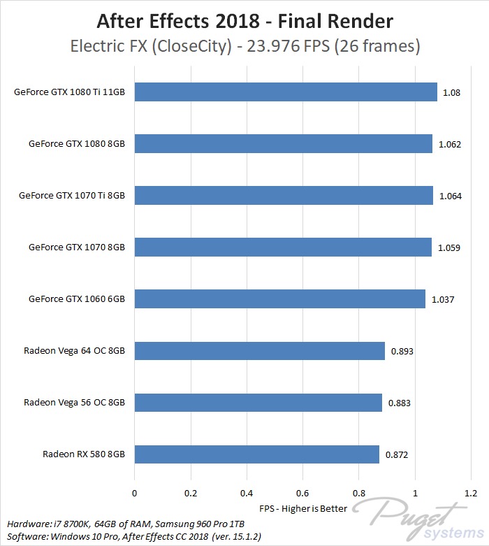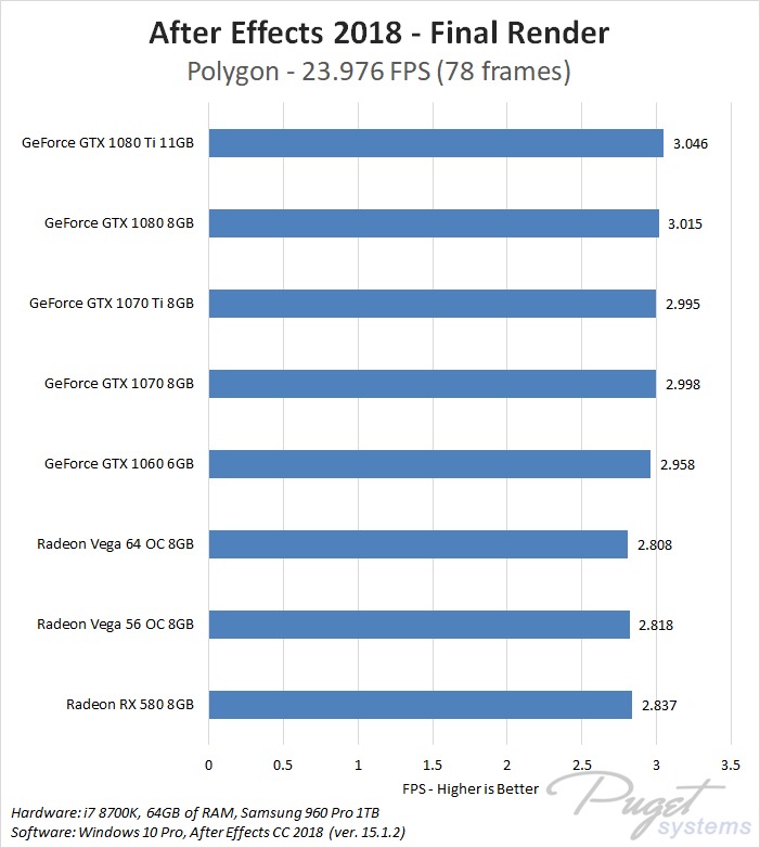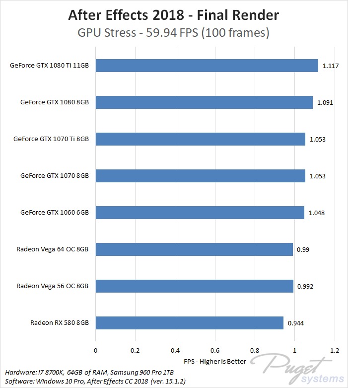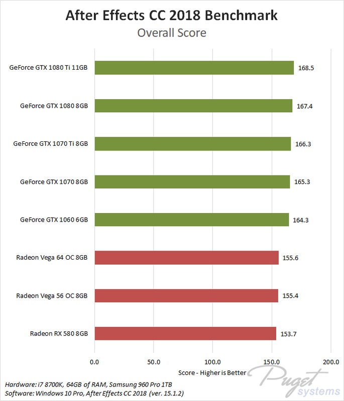 While GPU acceleration has become fairly common in Adobe applications, in most situations it is much more important to have a powerful CPU, plenty of RAM, and fast enough storage. Despite this, a popular request we get is to compare AMD's Radeon Vega video cards to NVIDIA's GeForce cards. In previous articles we have compared these cards in Premiere Pro, Photoshop and Media Encoder, and today we will be rounding out our Adobe testing with After Effects. It is worth noting that while we will be focusing on After Effects performance in this article, choosing a specific GPU to use is a much more complicated topic. Many other factors including current pricing, reliability, power draw, noise level, and available cooler designs are all things that need to be considered.