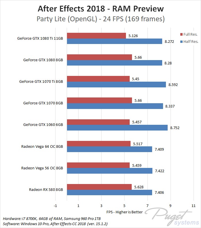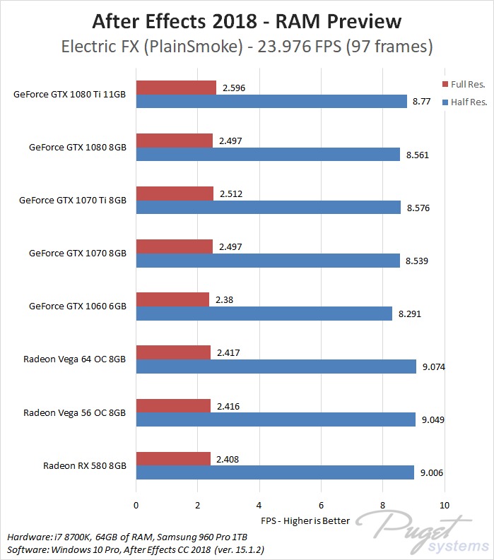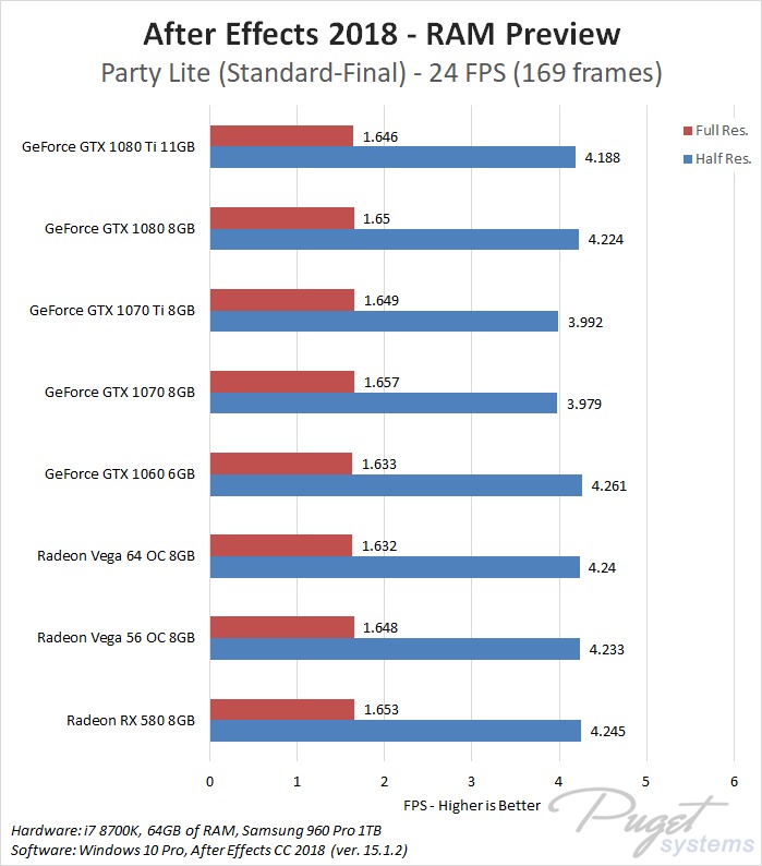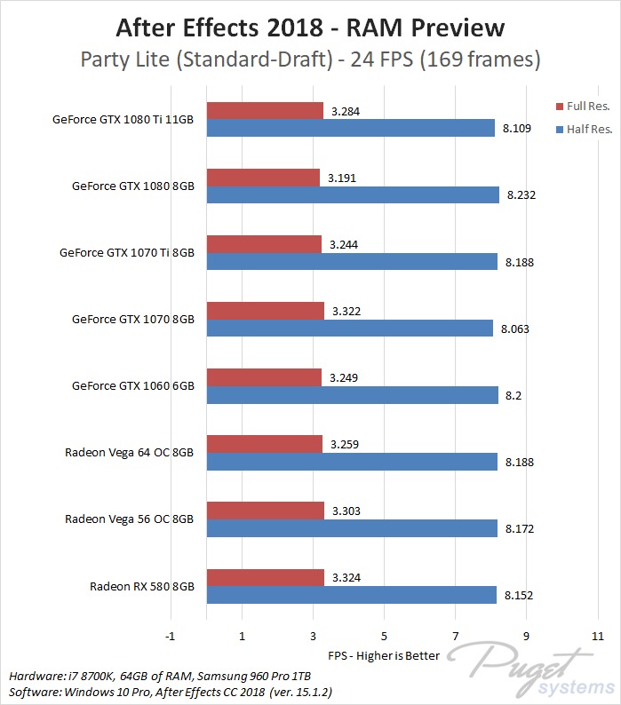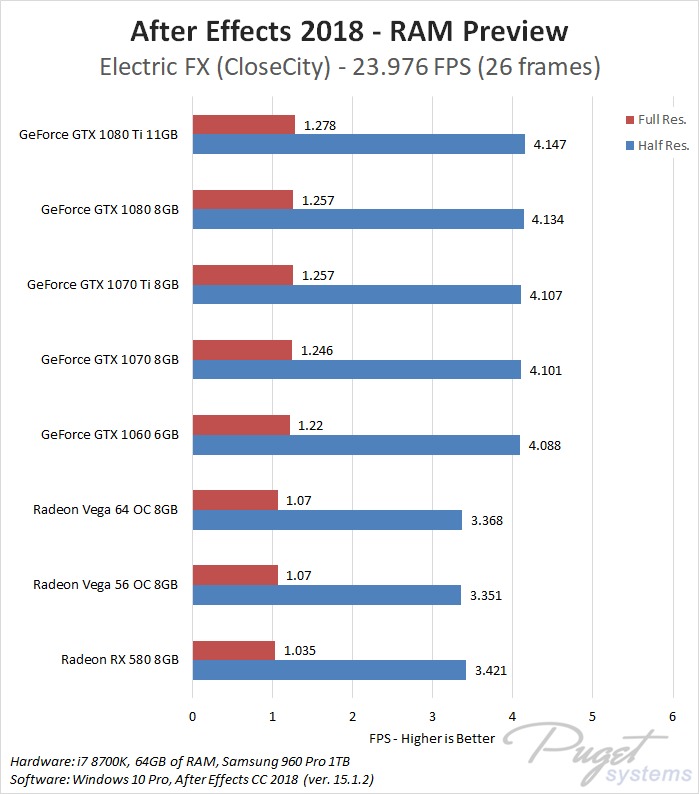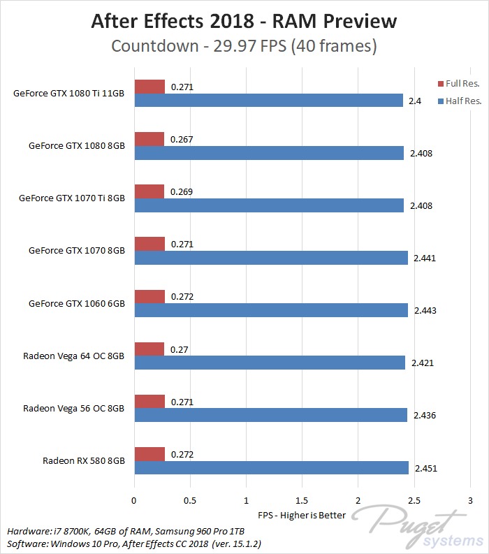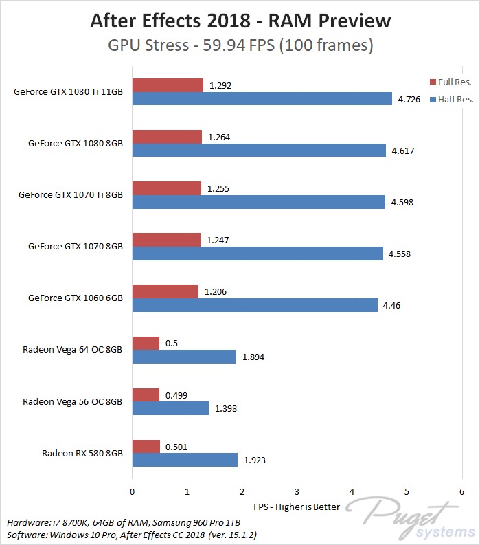 While GPU acceleration has become fairly common in Adobe applications, in most situations it is much more important to have a powerful CPU, plenty of RAM, and fast enough storage. Despite this, a popular request we get is to compare AMD's Radeon Vega video cards to NVIDIA's GeForce cards. In previous articles we have compared these cards in Premiere Pro, Photoshop and Media Encoder, and today we will be rounding out our Adobe testing with After Effects. It is worth noting that while we will be focusing on After Effects performance in this article, choosing a specific GPU to use is a much more complicated topic. Many other factors including current pricing, reliability, power draw, noise level, and available cooler designs are all things that need to be considered.