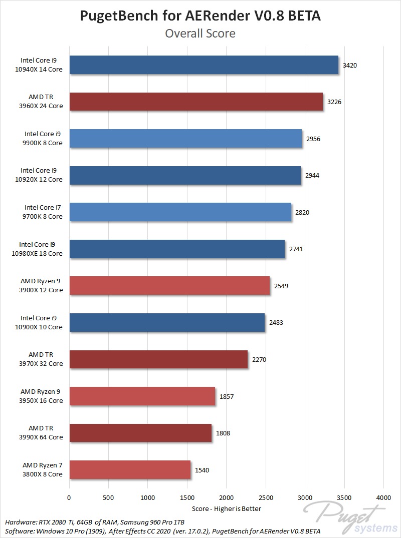 Since After Effects typically only uses a handful of CPU cores, there is only about a 20% performance difference between the fastest and slowest CPU we tested. Interestingly enough, it is more the overall product line that determines performance, rather than the number of cores each CPU has. In fact, it is worth pointing out that many of the more economical processors like the Intel Core i9 9900K or AMD Ryzen 9 3900X perform within a few percent of the more expensive options like the AMD Threadripper 3970X 32 Core.