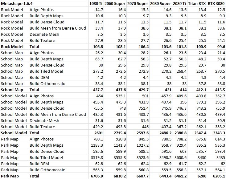 If you are curious about how the video card selection impacted individual steps within Metashape, this table shows those full details: