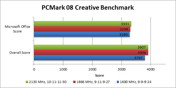Starting with how the RAM speed should affect programs that are primarily CPU-based, we started with PCMark08 and ran both the Creative suite and Microsoft Office suite of tests.